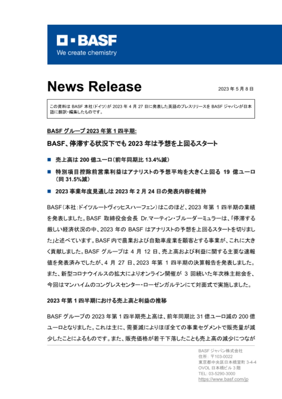 この資料はBASF本社(ドイツ)が2023年4月27日に発表した英語のプレスリリースをBASFジャパンが日本語に翻訳・編集したものです。