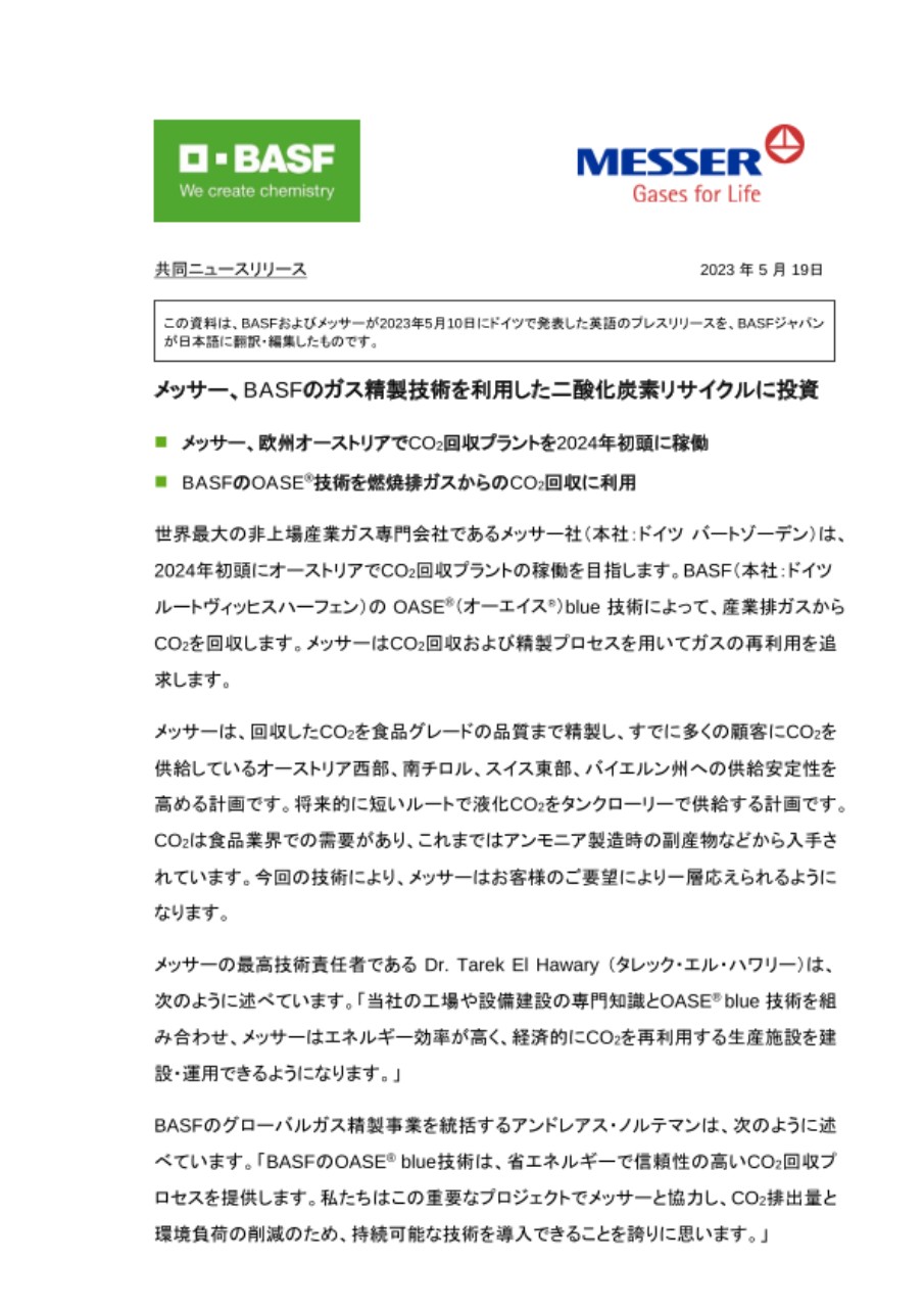 BASFのグローバルガス精製事業を統括するアンドレアス・ノルテマンは、次のように述べています。「BASFのOASE® blue技術は、省エネルギーで信頼性の高いCO2回収プロセスを提供します。私たちはこの重要なプロジェクトでメッサーと協力し、CO2排出量と環境負荷の削減のため、持続可能な技術を導入できることを誇りに思います。」