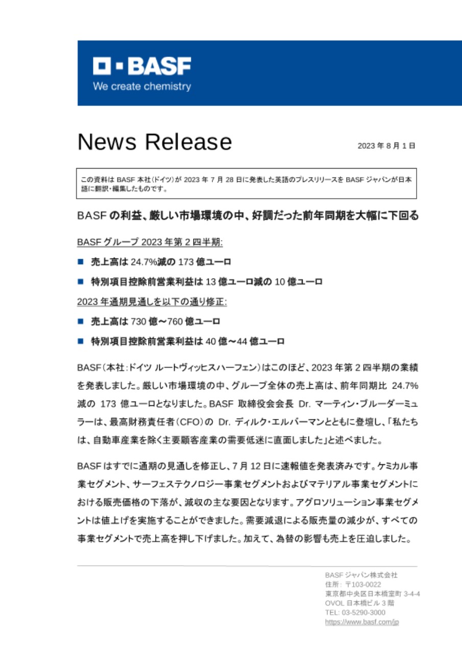 この資料はBASF本社(ドイツ)が2023年7月28日に発表した英語のプレスリリースをBASFジャパンが日本語に翻訳・編集したものです。