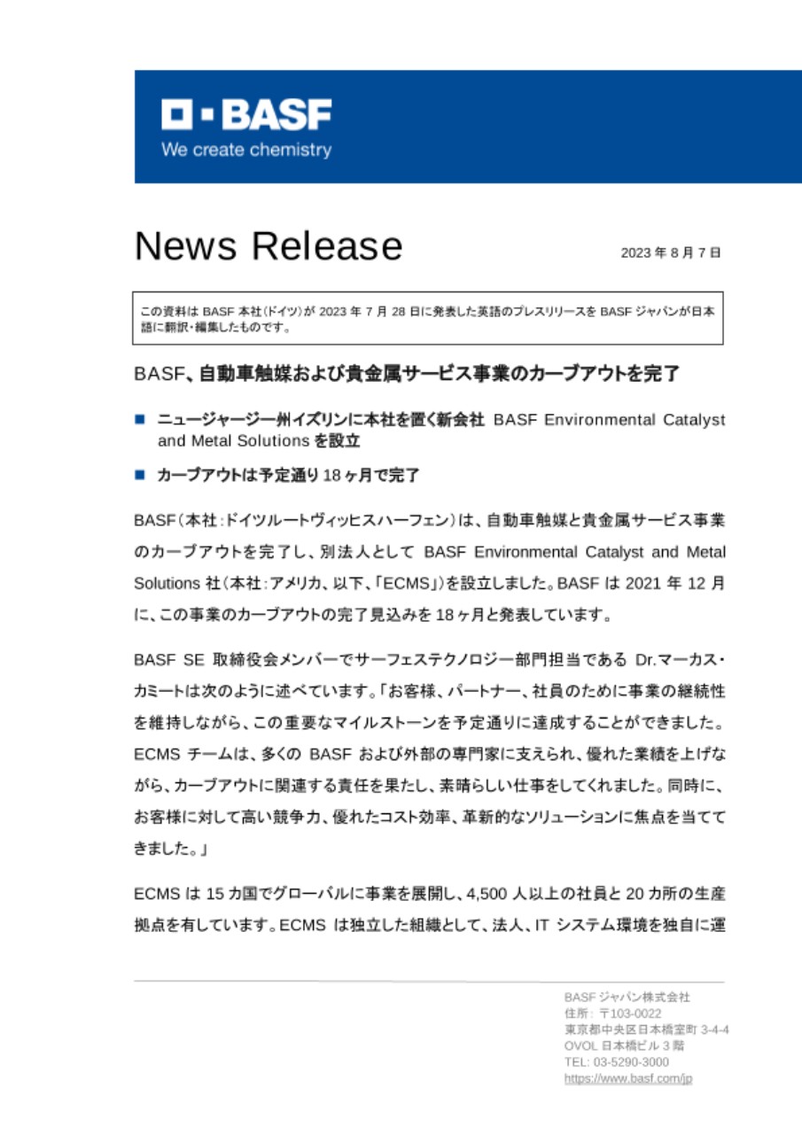 BASF(本社:ドイツルートヴィッヒスハーフェン)は、自動車触媒と貴金属サービス事業のカーブアウトを完了し、別法人としてBASF Environmental Catalyst and Metal Solutions社(本社:アメリカ、以下、「ECMS」)を設立しました。BASFは2021年12月に、この事業のカーブアウトの完了見込みを18ヶ月と発表しています。
