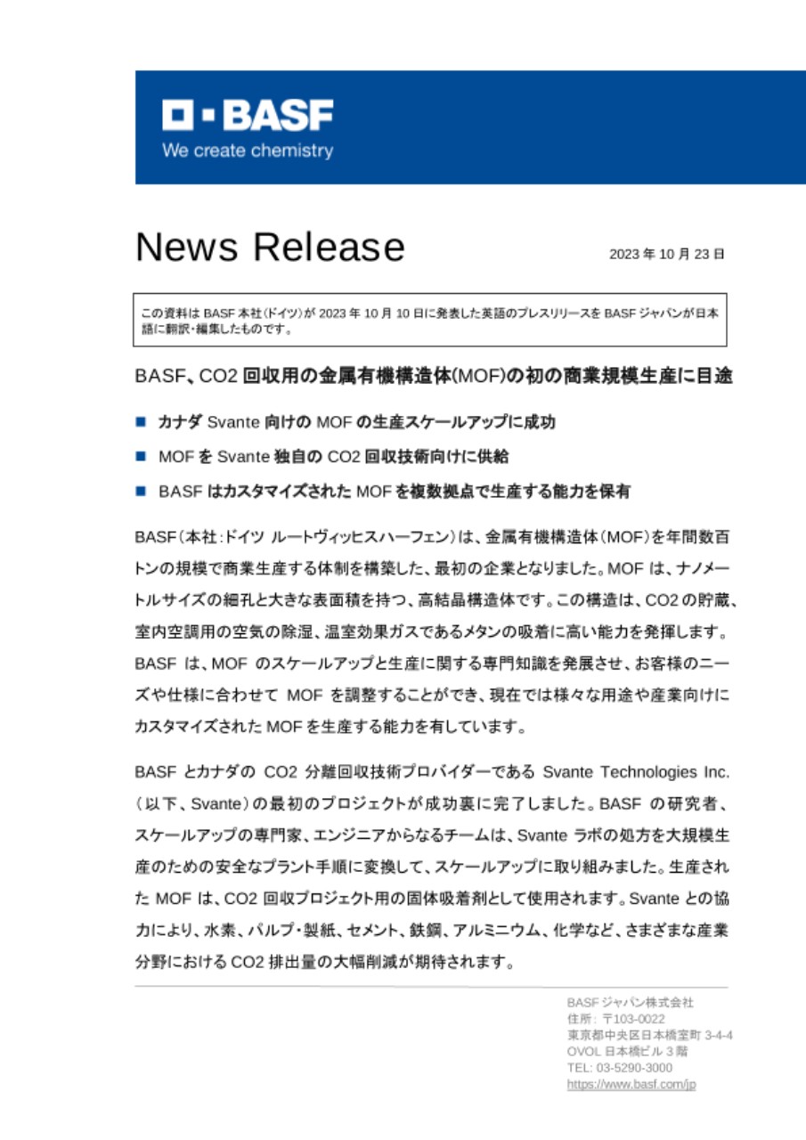 BASFとカナダのCO2分離回収技術プロバイダーであるSvante Technologies Inc.(以下、Svante)の最初のプロジェクトが成功裏に完了しました。BASFの研究者、スケールアップの専門家、エンジニアからなるチームは、Svanteラボの処方を大規模生産のための安全なプラント手順に変換して、スケールアップに取り組みました。生産されたMOFは、CO2回収プロジェクト用の固体吸着剤として使用されます。Svanteとの協力により、水素、パルプ・製紙、セメント、鉄鋼、アルミニウム、化学など、さまざまな産業分野におけるCO2排出量の大幅削減が期待されます。