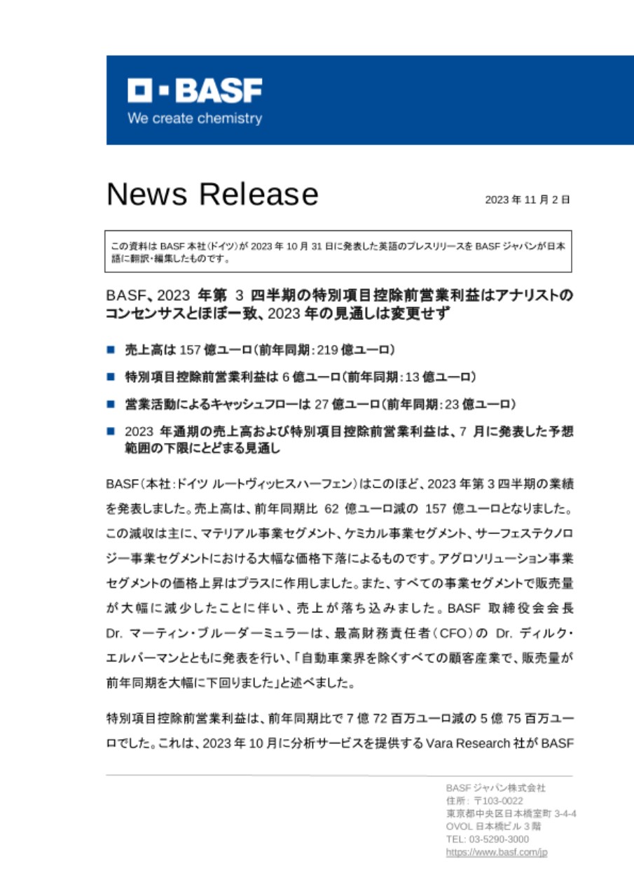 この資料はBASF本社(ドイツ)が2023年10月31日に発表した英語のプレスリリースをBASFジャパンが日本語に翻訳・編集したものです。