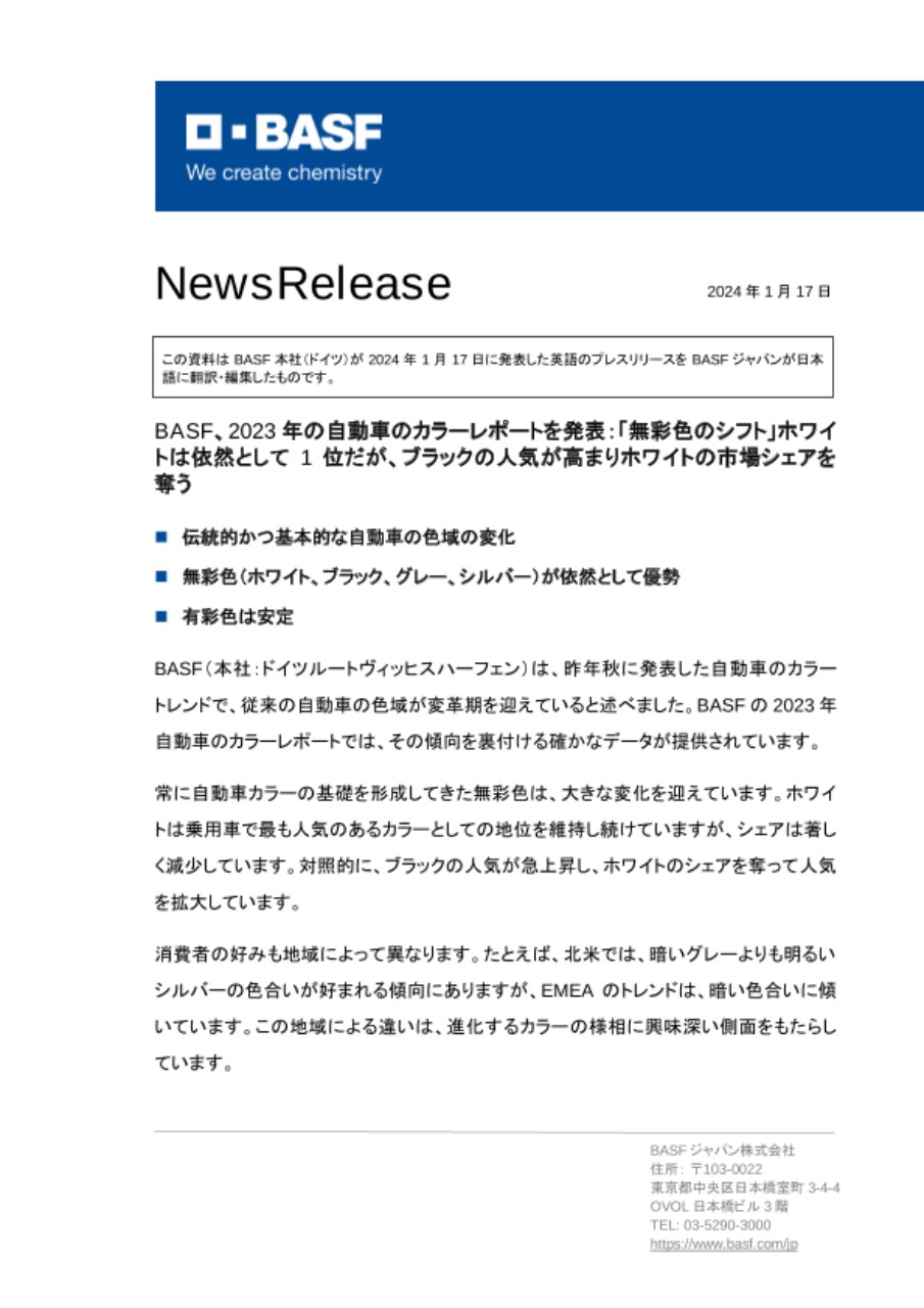 BASF、2023年の自動車のカラーレポートを発表:「無彩色のシフト」ホワイトは依然として1位だが、ブラックの人気が高まりホワイトの市場シェアを