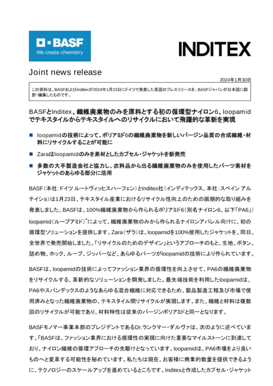 この資料は、BASFおよびInditexが2024年1月23日にドイツで発表した英語のプレスリリースを、BASFジャパンが日本語に翻訳・編集したものです。