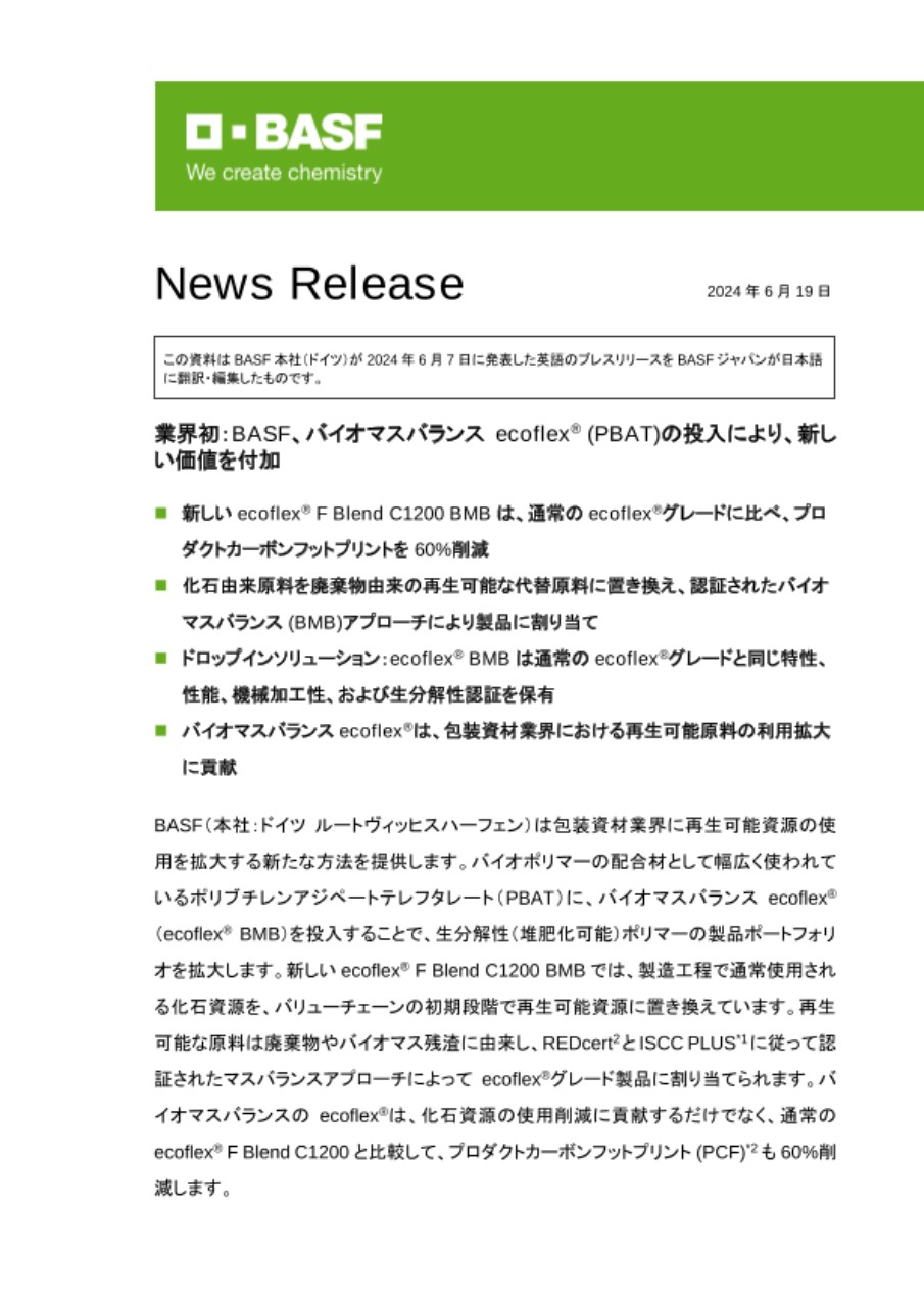 BASF(本社:ドイツ ルートヴィッヒスハーフェン)は包装資材業界に再生可能資源の使用を拡大する新たな方法を提供します。バイオポリマーの配合材として幅広く使われているポリブチレンアジペートテレフタレート(PBAT)に、バイオマスバランスecoflex®(ecoflex® BMB)を投入することで、生分解性(堆肥化可能)ポリマーの製品ポートフォリオを拡大します。新しいecoflex® F Blend C1200 BMBでは、製造工程で通常使用される化石資源を、バリューチェーンの初期段階で再生可能資源に置き換えています。再生可能な原料は廃棄物やバイオマス残渣に由来し、REDcert2とISCC PLUS*1に従って認証されたマスバランスアプローチによってecoflex®グレード製品に割り当てられます。バイオマスバランスのecoflex®は、化石資源の使用削減に貢献するだけでなく、通常のecoflex® F Blend C1200と比較して、プロダクトカーボンフットプリント (PCF)*2 も60%削減します。