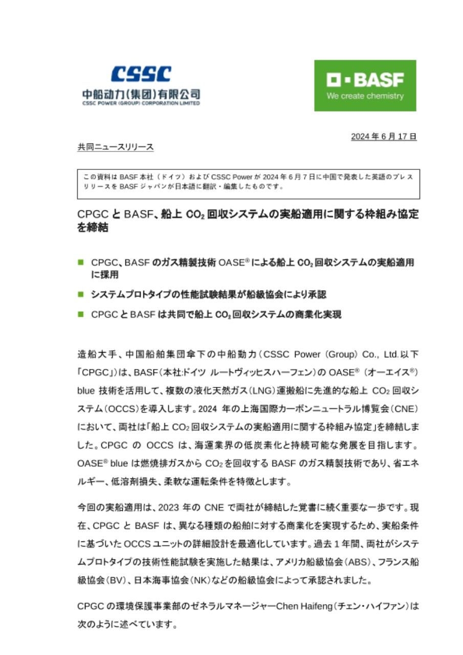 - CPGCとBASFは共同で船上CO₂回収システムの商業化実現