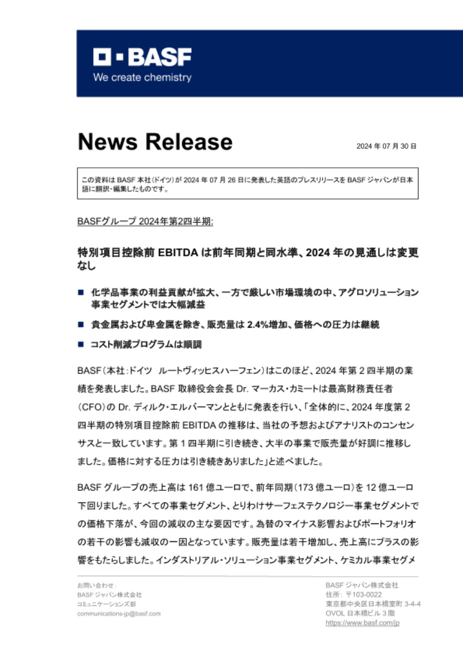この資料はBASF本社(ドイツ)が2024年07月26日に発表した英語のプレスリリースをBASFジャパンが日本語に翻訳・編集したものです。