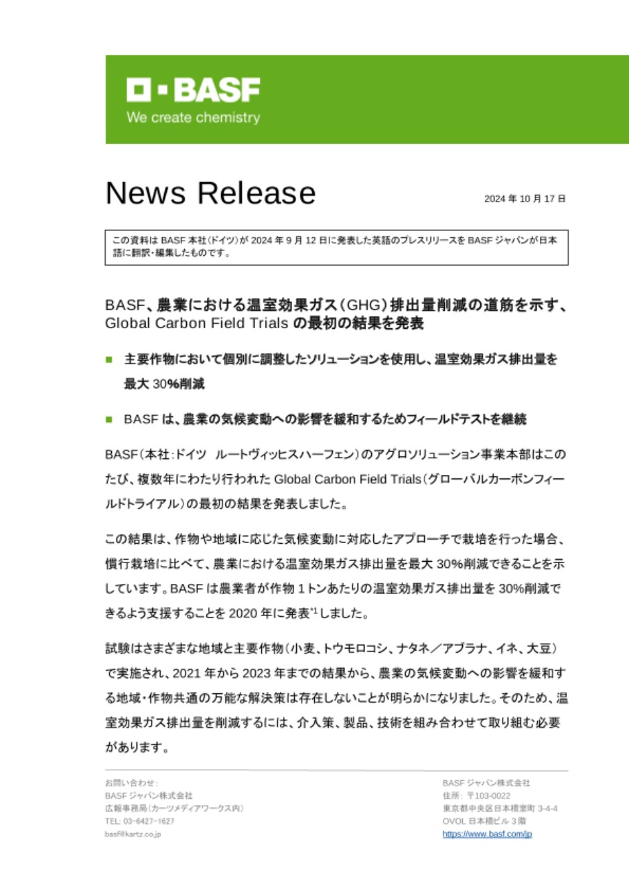 BASF(本社:ドイツ ルートヴィッヒスハーフェン)のアグロソリューション事業本部はこのたび、複数年にわたり行われたGlobal Carbon Field Trials(グローバルカーボンフィールドトライアル)の最初の結果を発表しました。