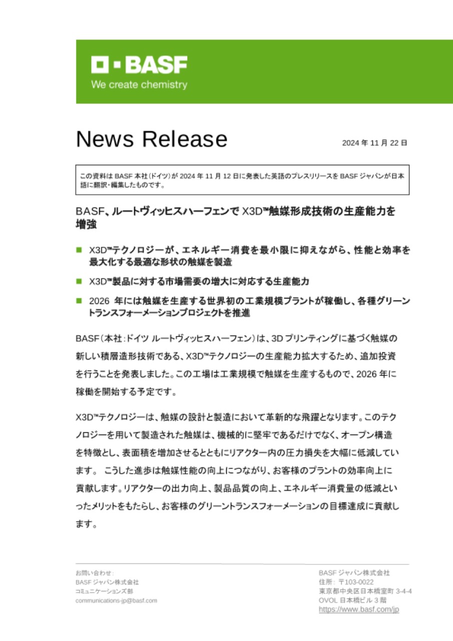 この資料は BASF 本社(ドイツ)が 2024 年 11 月 12 日に発表した英語のプレスリリースを BASF ジャパンが日本語に翻訳・編集したものです。