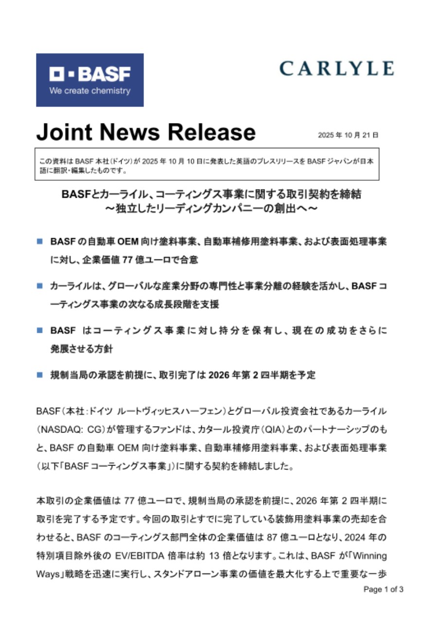 BASF(本社:ドイツ ルートヴィッヒスハーフェン)とグローバル投資会社であるカーライル(NASDAQ: CG)が管理するファンドは、カタール投資庁(QIA)とのパートナーシップのもと、BASFの自動車OEM向け塗料事業、自動車補修用塗料事業、および表面処理事業(以下「BASFコーティングス事業」)に関する契約を締結しました。