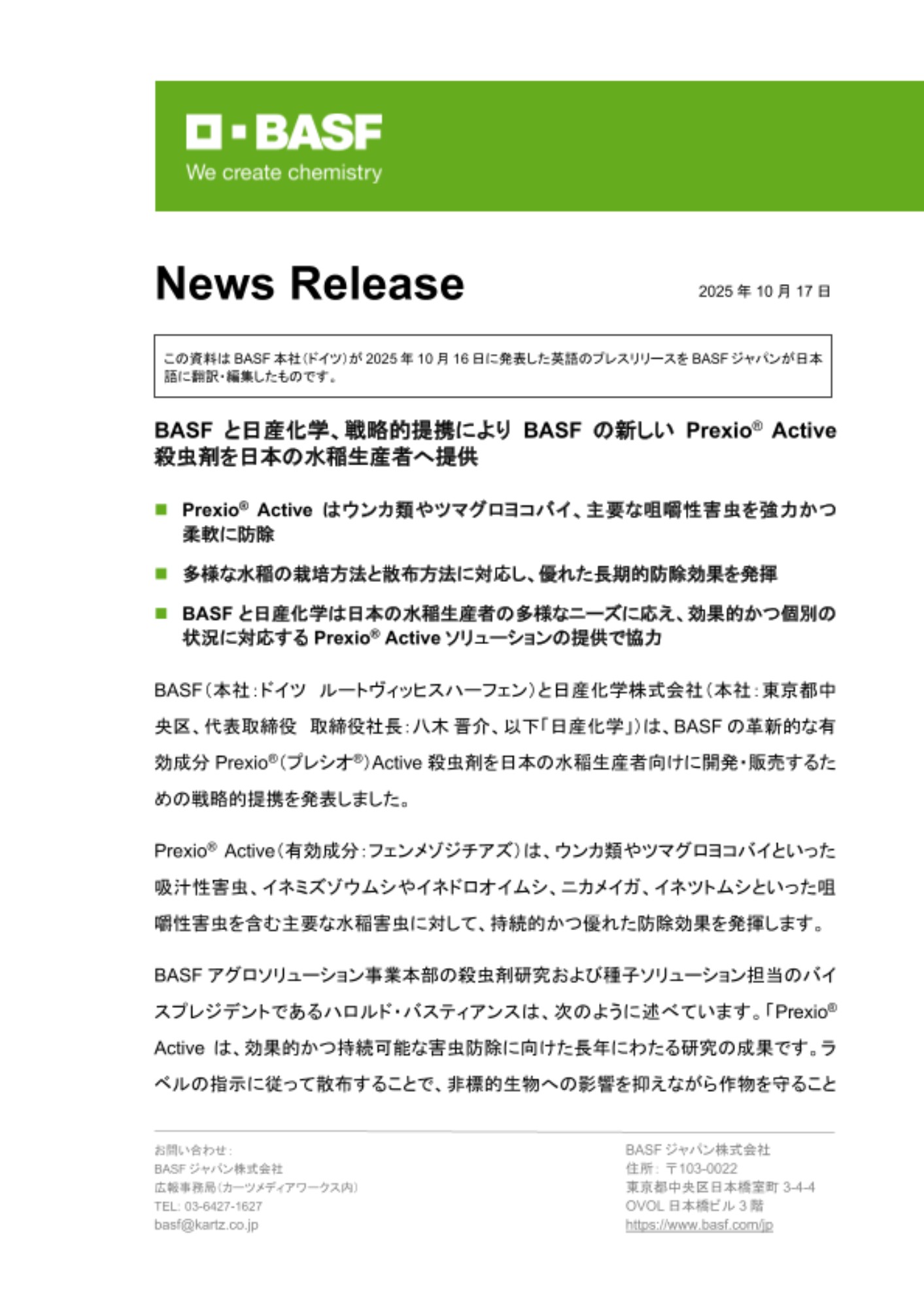 BASF(本社:ドイツ ルートヴィッヒスハーフェン)と日産化学株式会社(本社:東京都中央区、代表取締役 取締役社長:八木 晋介、以下「日産化学」)は、BASFの革新的な有効成分Prexio®(プレシオ®)Active殺虫剤を日本の水稲生産者向けに開発・販売するための戦略的提携を発表しました。