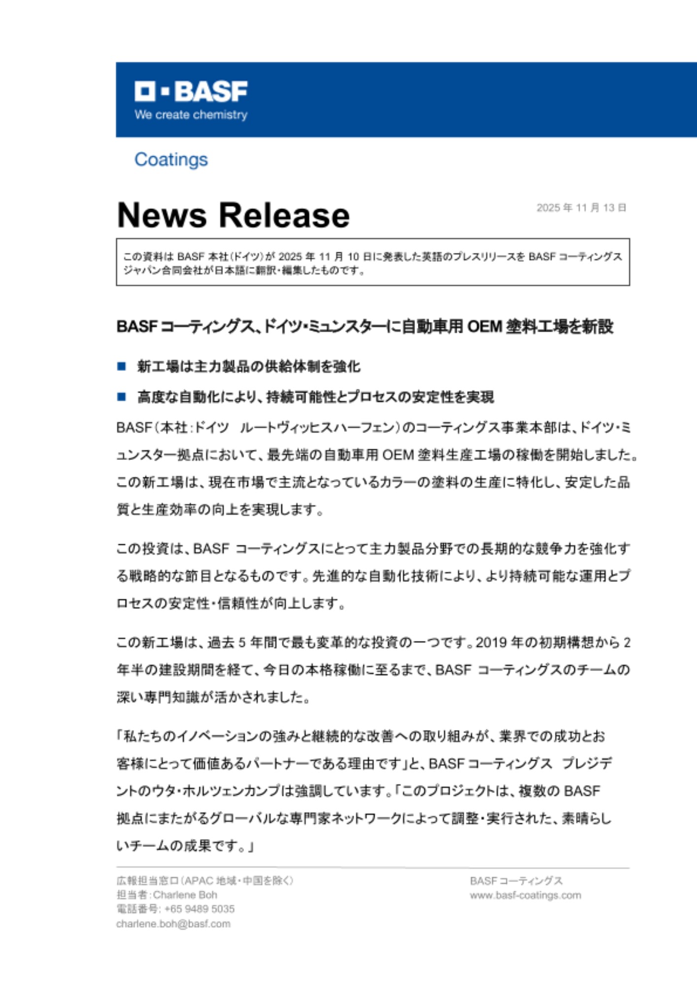 この資料はBASF本社(ドイツ)が2025年11月10日に発表した英語のプレスリリースをBASFコーティングスジャパン合同会社が日本語に翻訳・編集したものです。