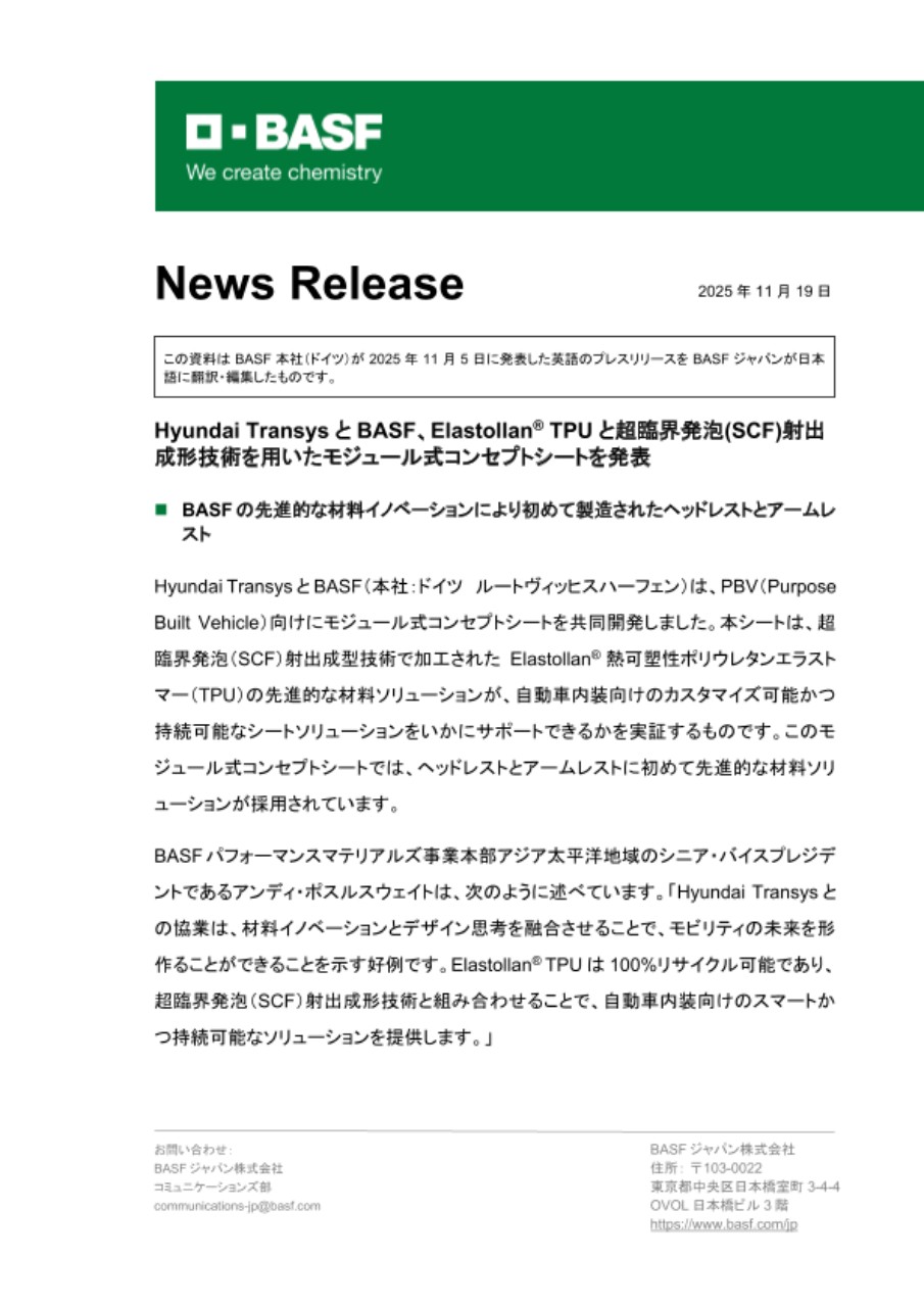 BASFパフォーマンスマテリアルズ事業本部アジア太平洋地域のシニア・バイスプレジデントであるアンディ・ポスルスウェイトは、次のように述べています。「Hyundai Transysとの協業は、材料イノベーションとデザイン思考を融合させることで、モビリティの未来を形作ることができることを示す好例です。Elastollan® TPUは100%リサイクル可能であり、超臨界発泡(SCF)射出成形技術と組み合わせることで、自動車内装向けのスマートかつ持続可能なソリューションを提供します。」