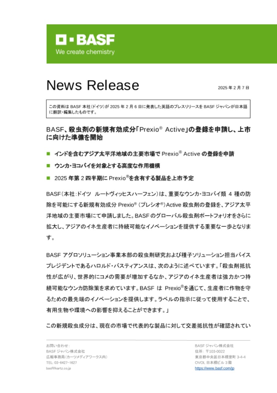 BASF、殺虫剤の新規有効成分「Prexio® Active」の登録を申請し、上市に向けた準備を開始