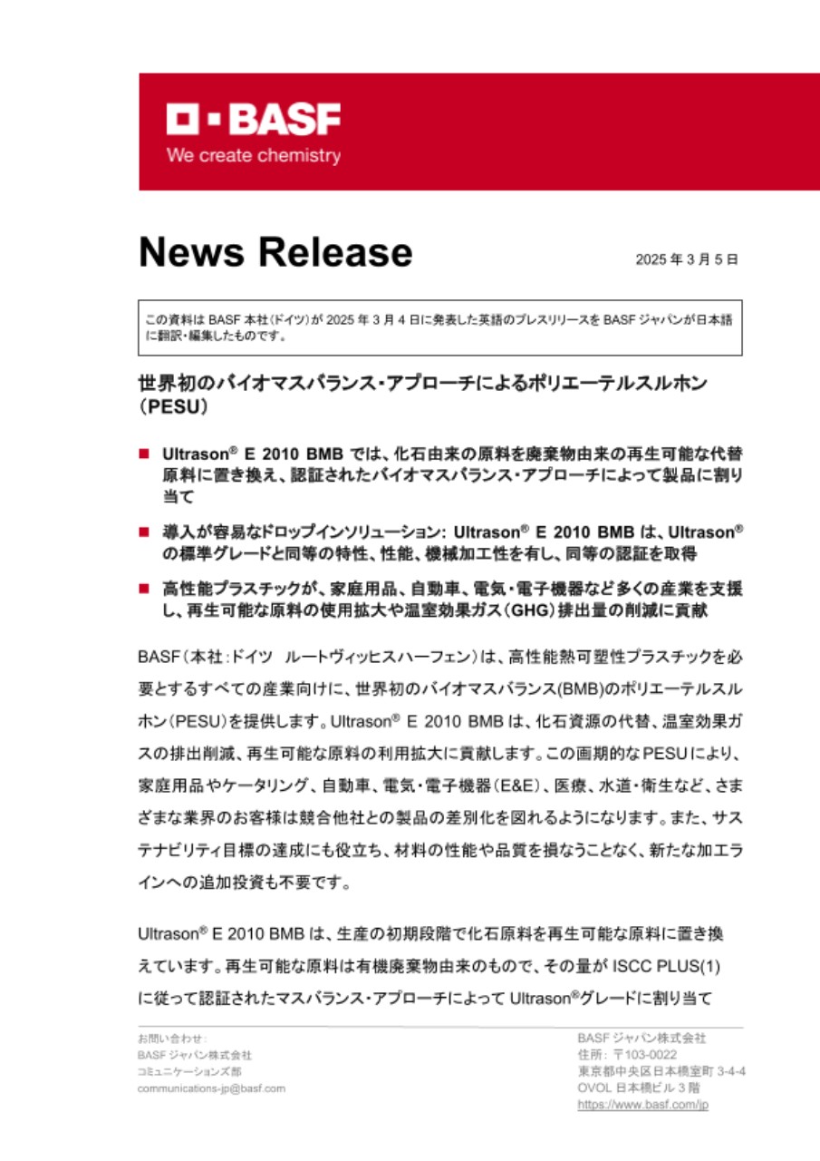 BASF(本社:ドイツ ルートヴィッヒスハーフェン)は、高性能熱可塑性プラスチックを必要とするすべての産業向けに、世界初のバイオマスバランス(BMB)のポリエーテルスルホン(PESU)を提供します。Ultrason® E 2010 BMBは、化石資源の代替、温室効果ガスの排出削減、再生可能な原料の利用拡大に貢献します。この画期的なPESUにより、家庭用品やケータリング、自動車、電気・電子機器(E&E)、医療、水道・衛生など、さまざまな業界のお客様は競合他社との製品の差別化を図れるようになります。また、サステナビリティ目標の達成にも役立ち、材料の性能や品質を損なうことなく、新たな加工ラインへの追加投資も不要です。