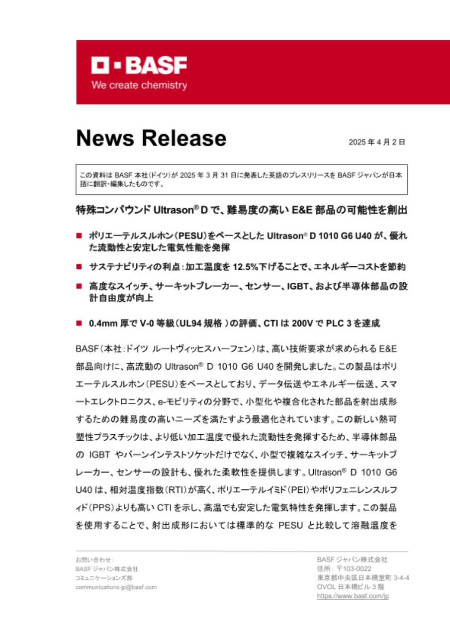 BASFのパフォーマンスマテリアルズ事業部スペシャリティーポリマーUltrason® 市場開発の貴田和広は、次のように述べています。「この新しいUltrason® Dは、電気的・機械的特性に対して特殊な要求がある、エネルギー効率の高い電子デバイスの開発に最適です。定評のある当社のポリエーテルスルホンUltrason® Eの優れた特性を受け継ぎながら、E&E用途における性能の最適化、優れた流動性、加工エネルギーを低減し持続可能な使用を実現します。これにより、e-モビリティや家電部品の新たな可能性が広がります。また、過酷な動作条件下で電圧やデータレートが上昇する用途での、安全性の向上にも貢献します。」