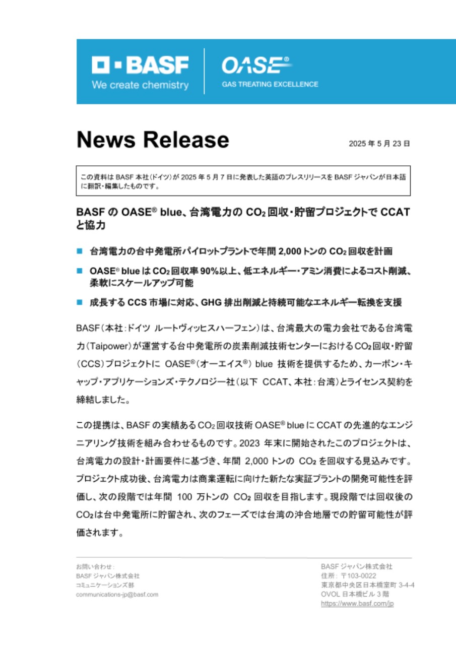 BASF(本社:ドイツ ルートヴィッヒスハーフェン)は、台湾最大の電力会社である台湾電力(Taipower)が運営する台中発電所の炭素削減技術センターにおけるCO2回収・貯留(CCS)プロジェクトにOASE®(オーエイス®) blue技術を提供するため、カーボン・キャップ・アプリケーションズ・テクノロジー社(以下CCAT、本社:台湾)とライセンス契約を締結しました。