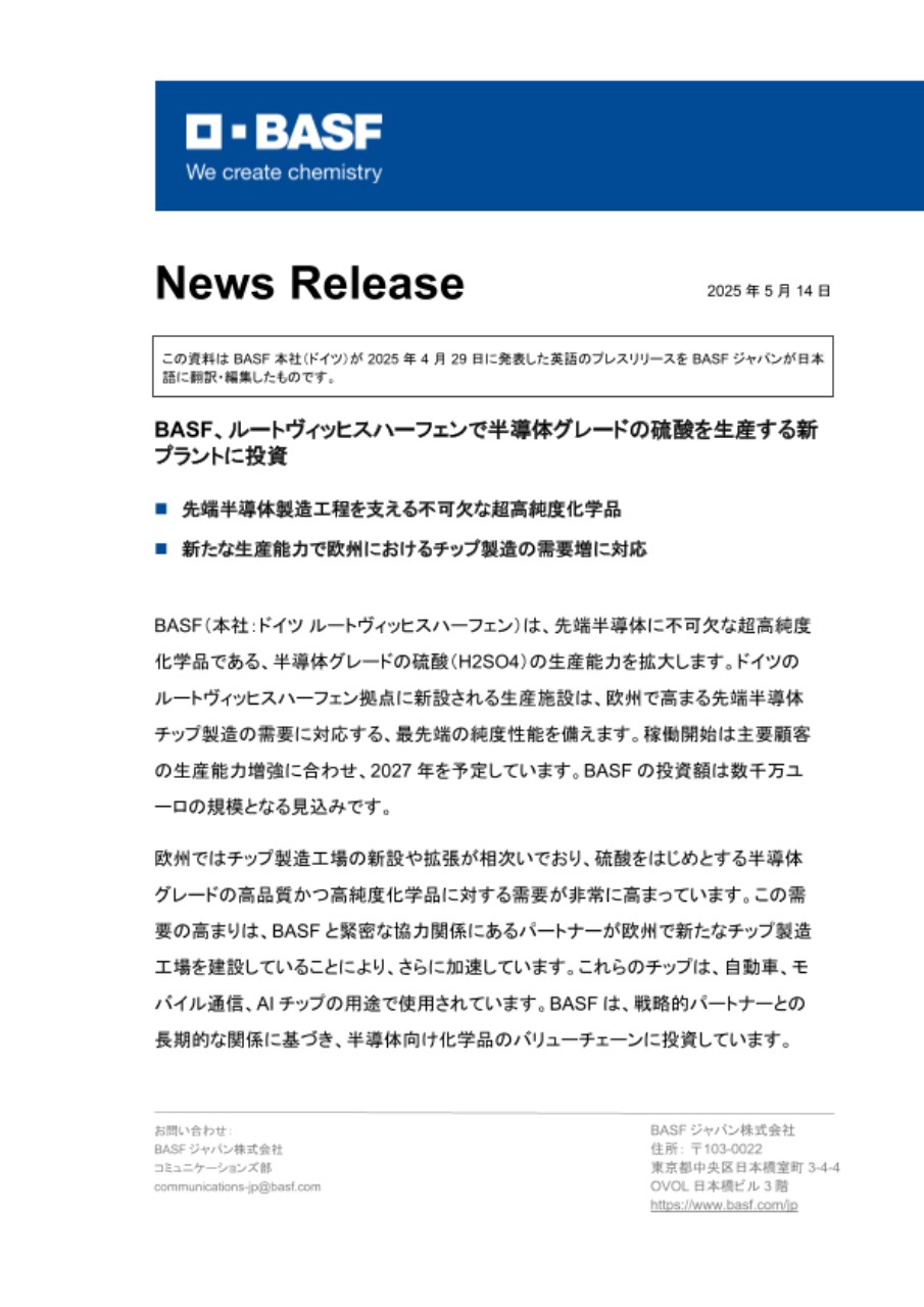 この資料はBASF本社(ドイツ)が2025年4月29日に発表した英語のプレスリリースをBASFジャパンが日本語に翻訳・編集したものです。