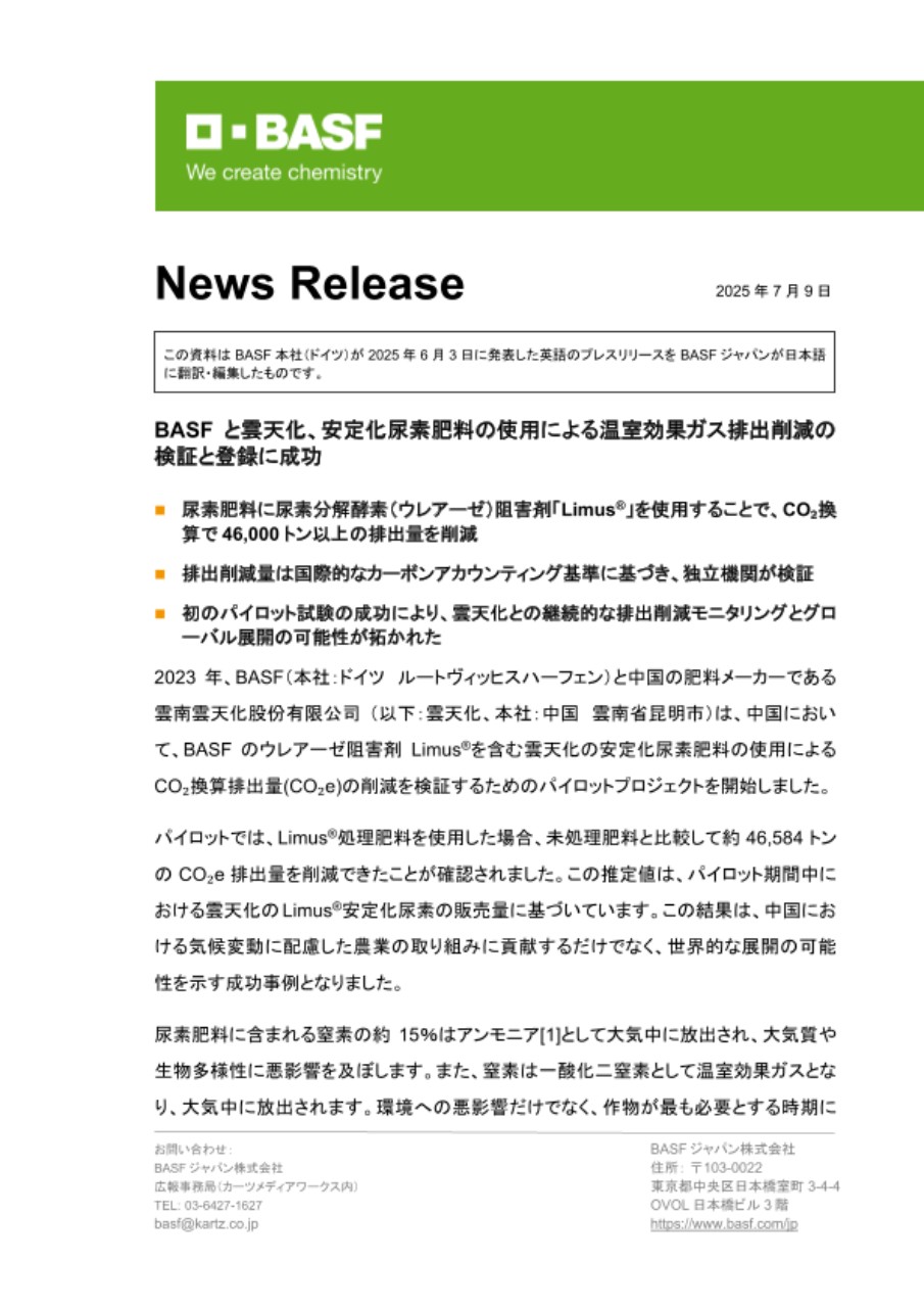 BASFと雲天化、安定化尿素肥料の使用による温室効果ガス排出削減の検証と登録に成功