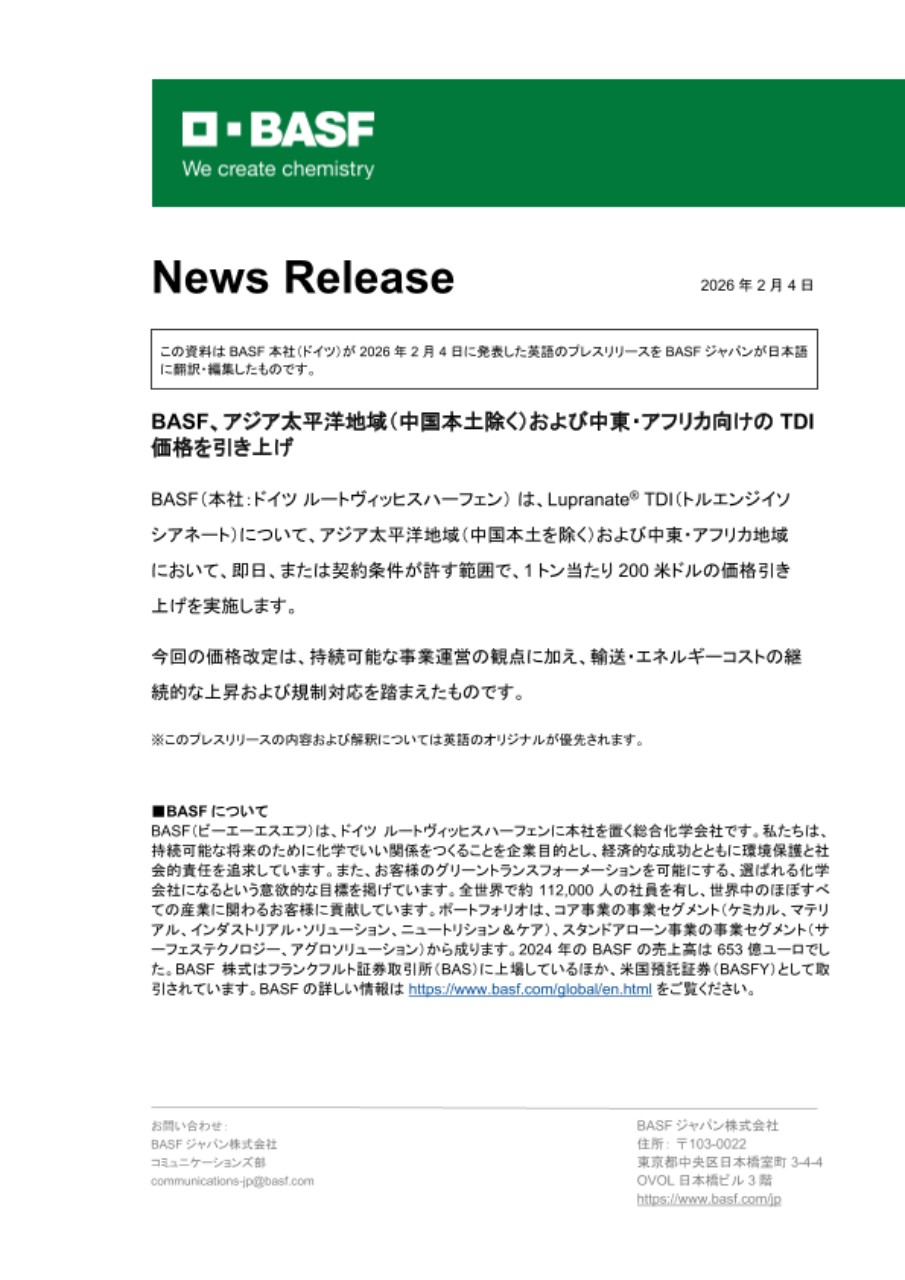 BASF(本社:ドイツ ルートヴィッヒスハーフェン) は、Lupranate® TDI(トルエンジイソシアネート)について、アジア太平洋地域(中国本土を除く)および中東・アフリカ地域において、即日、または契約条件が許す範囲で、1トン当たり200米ドルの価格引き上げを実施します。