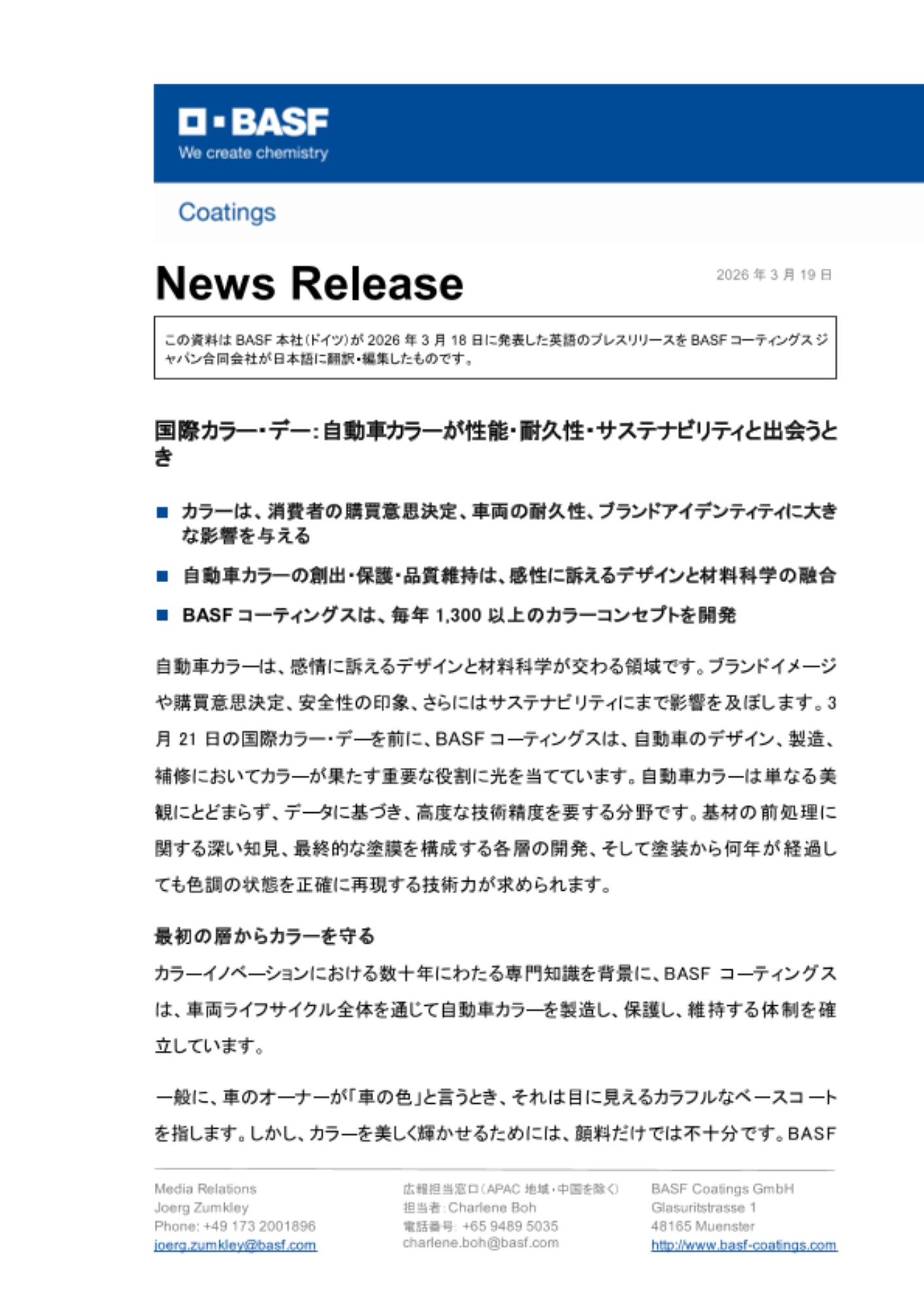 この資料は BASF 本社(ドイツ)が2026年3月18日に発表した英語のプレスリリースを BASF コーティングス ジャパン合同会社が日本語に翻訳・編集したものです。