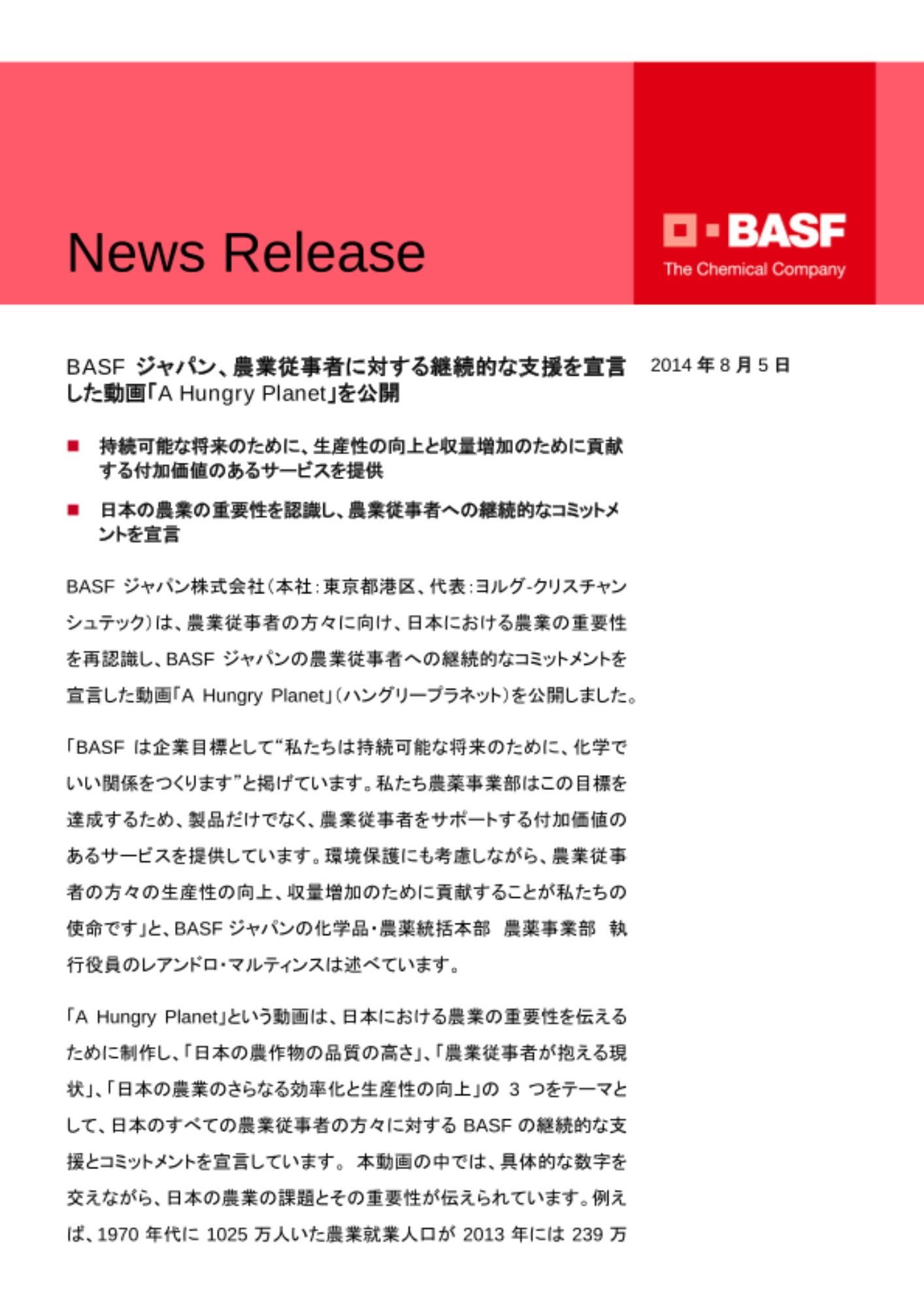 BASF ジャパン株式会社(本社:東京都港区、代表:ヨルグ - クリスチャン シュテック)は、農業従事者の方々に向け、日本における農業の重要性を再認識し、 BASF ジャパンの農業従事者への継続的なコミットメントを宣言した動画「 A Hungry Planet 」(ハングリープラネット)を公開しました。