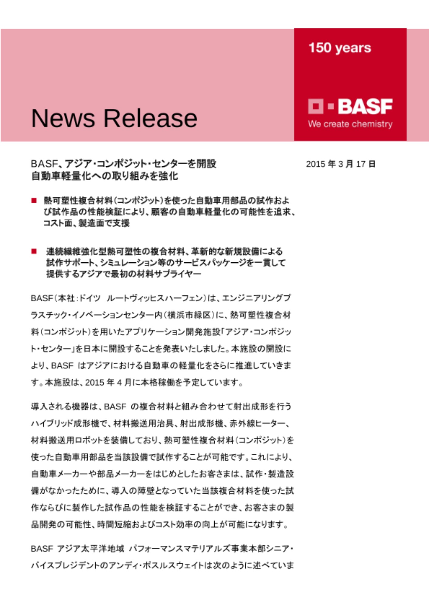 BASF (本社:ドイツ ルートヴィッヒスハーフェン)は、エンジニアリングプラスチック・イノベーションセンター内(横浜市緑区)に、熱可塑性複合材料(コンポジット)を用いたアプリケーション開発施設「アジア・コンポジット・センター」を日本に開設することを発表いたしました。本施設の開設により、 BASF はアジアにおける自動車の軽量化をさらに推進していきます。本施設は、 2015 年 4 月に本格稼働を予定しています。