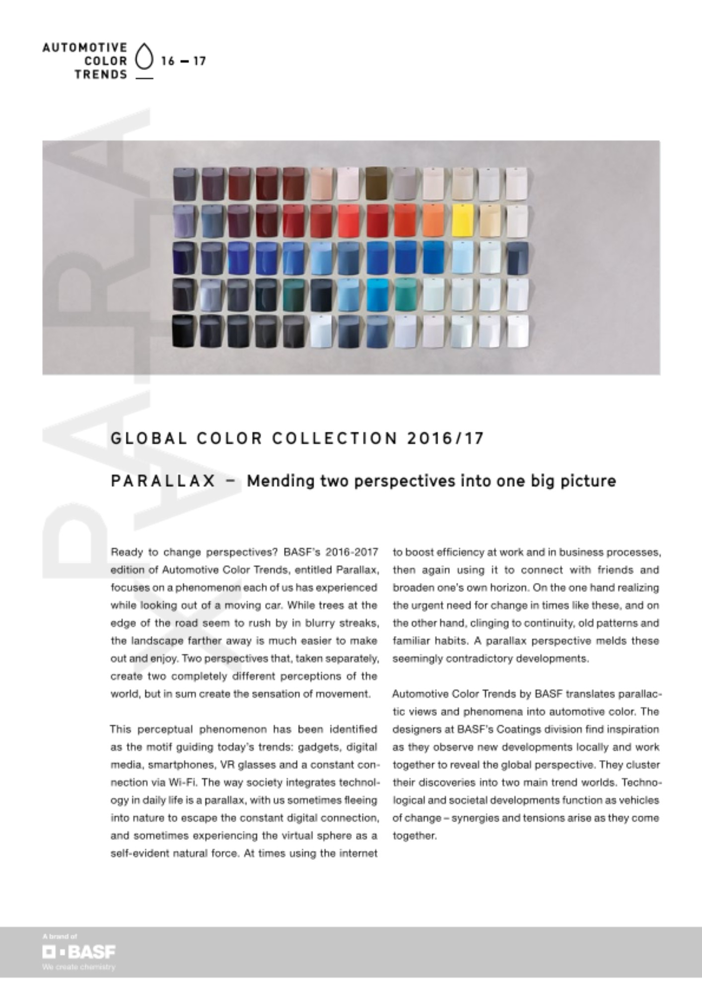 BASFの最新のカラートレンド予測のテーマは、「パララックス」(多面的な視点)です。パララックスとは、1つのモノを2つの異なる視点から見たときの、見え方の違い(視差)のことで、現代社会のバーチャルな世界の魅力と、リアルな現実世界での自己表現への憧れという視差を表現しています。今回は、このテーマのもと65色の自動車カラーを提案しています。
