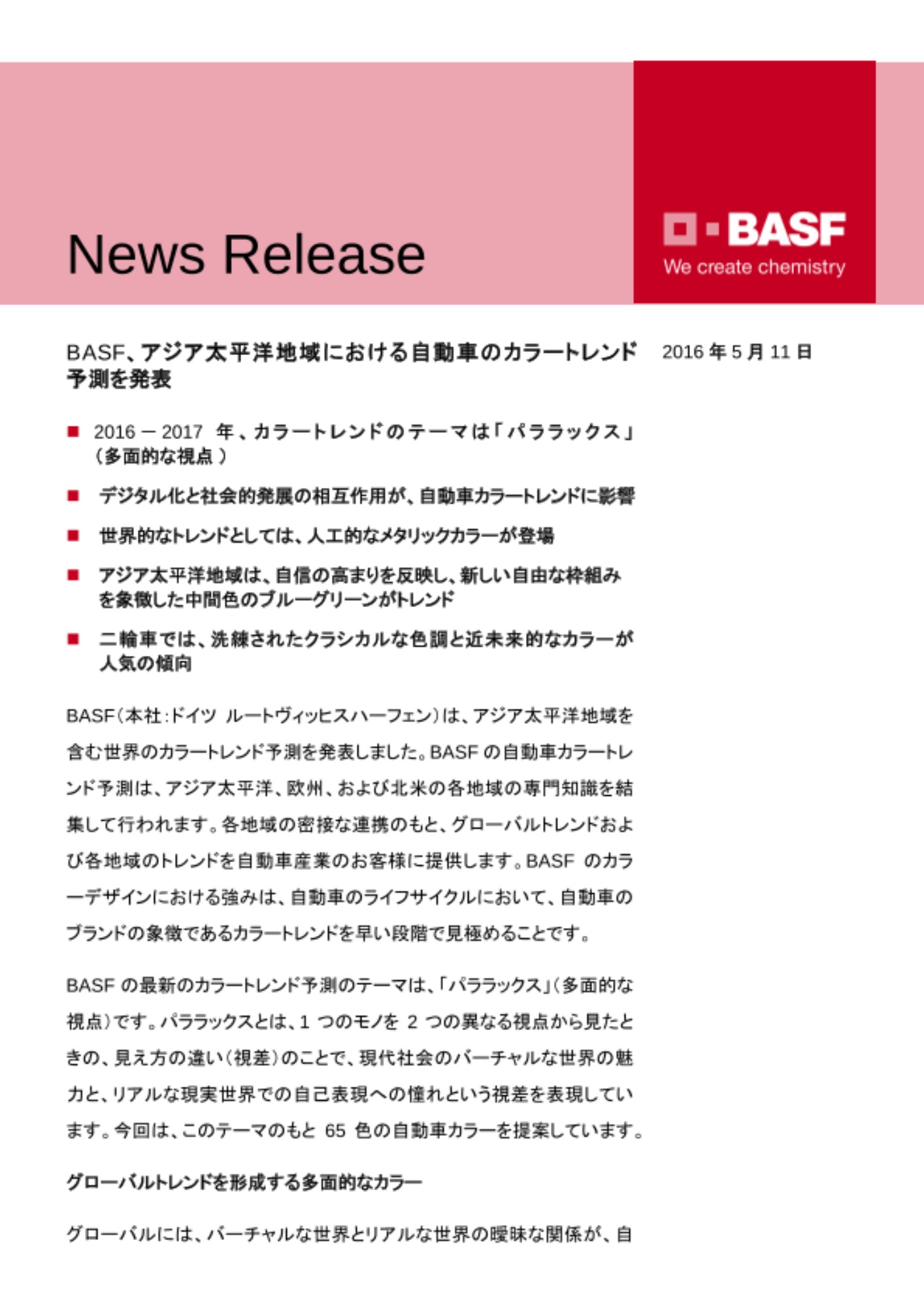 BASFジャパン株式会社コーティングス事業部 カラーデザインセンター アジア・パシフィックのチーフカラーデザイナーである松原千春は次のように述べています。「BASFは、今後重要な役割を担う自動車カラーの予測を毎年行っています。カラートレンド予測では、有彩色の動向にも重点的に取り組んでいますが、これは、ホワイト、グレー、ブラックの無彩色と比べて、有彩色のトレンドは変化が速く、自動車メーカーのお客様がエンドユーザーにアピールする上で戦略的に重要であると考えているためです。BASFは世界をリードする自動車塗料サプライヤーとして、自動車業界と密接に連携し、当該地域のお客様にサービスをお届けし、最新のカラー情報をご提供します。」