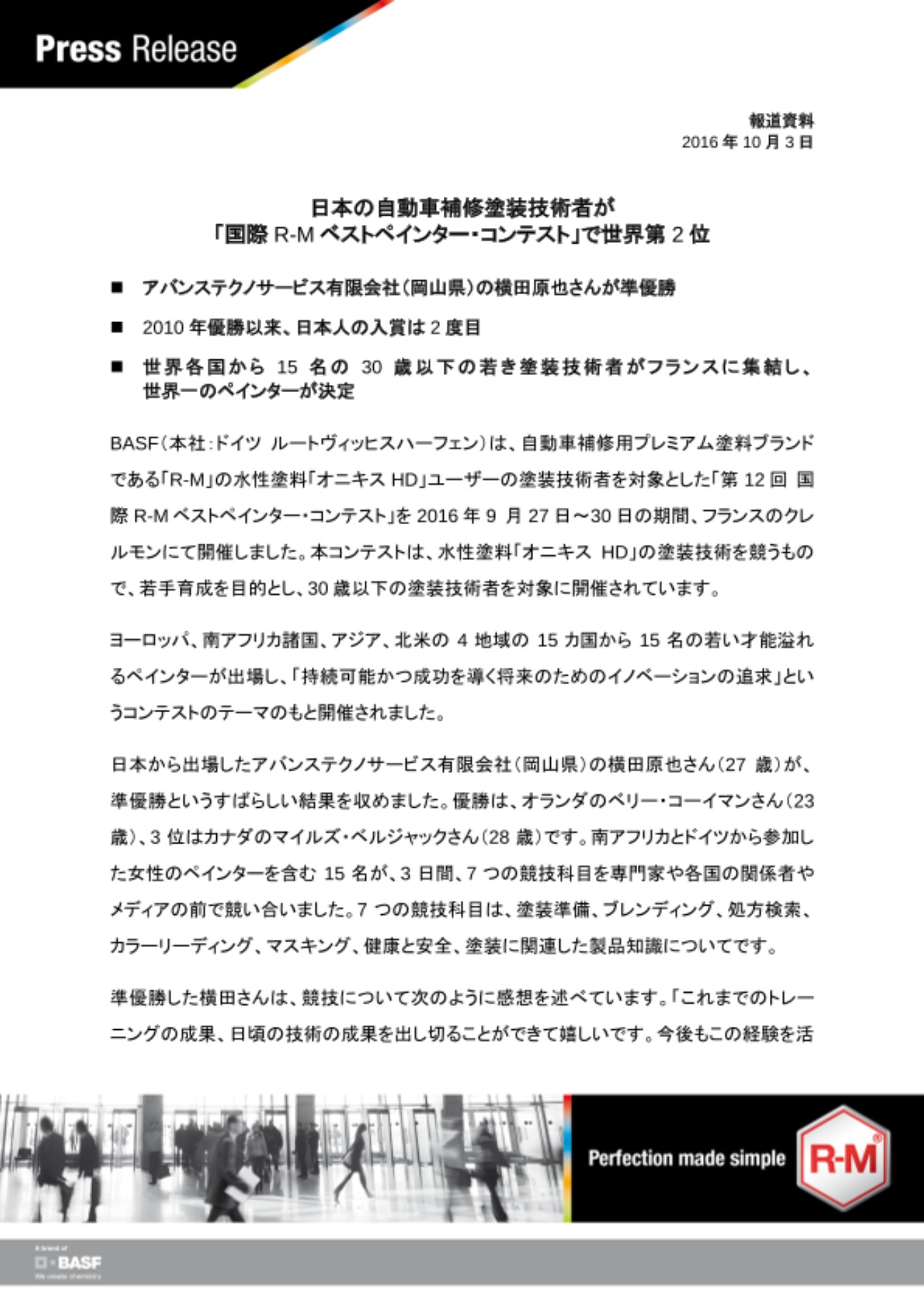 BASF(本社:ドイツ ルートヴィッヒスハーフェン)は、自動車補修用プレミアム塗料ブランドである「R-M」の水性塗料「オニキスHD」ユーザーの塗装技術者を対象とした「第12回 国際R-Mベストペインター・コンテスト」を2016年9 月27日~30日の期間、フランスのクレルモンにて開催しました。本コンテストは、水性塗料「オニキスHD」の塗装技術を競うもので、若手育成を目的とし、30歳以下の塗装技術者を対象に開催されています。