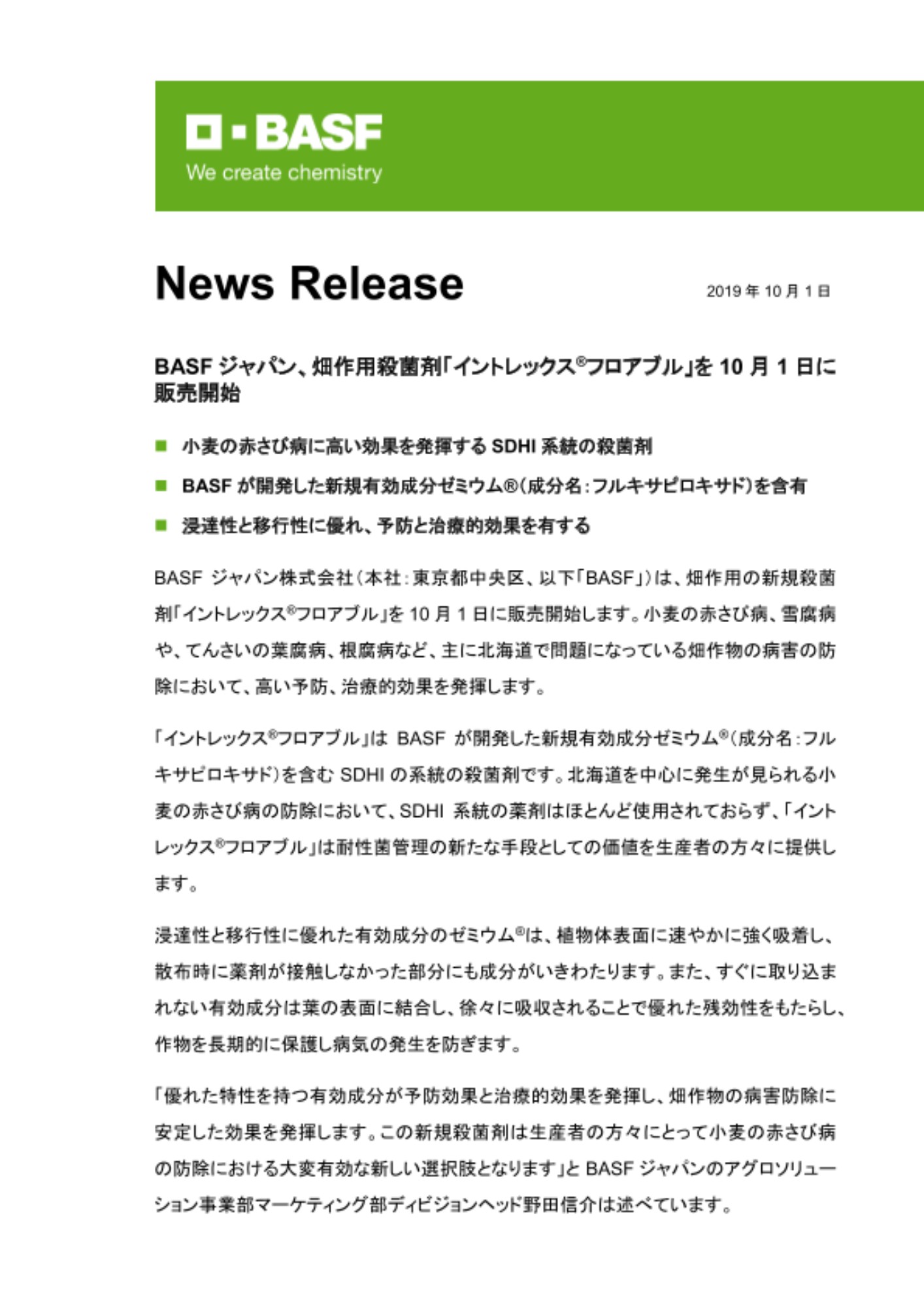 BASFジャパン、畑作用殺菌剤「イントレックス®フロアブル」を10月1日に販売開始