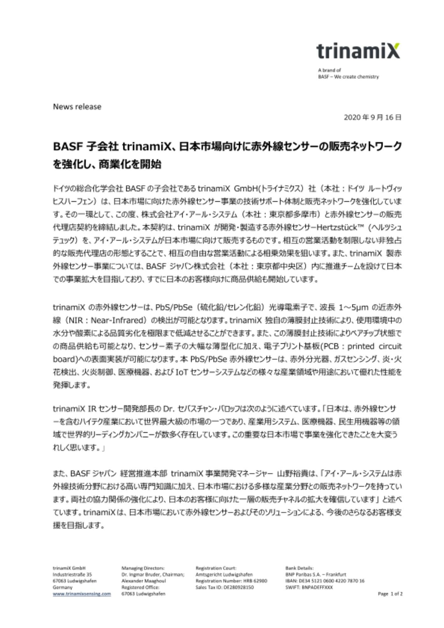 ドイツの総合化学会社BASFの子会社であるtrinamiX GmbH(トライナミクス)社(本社:ドイツ ルートヴィッヒスハーフェン)は、日本市場に向けた赤外線センサー事業の技術サポート体制と販売ネットワークを強化しています。その一環として、この度、株式会社アイ・アール・システム(本社:東京都多摩市)と赤外線センサーの販売代理店契約を締結しました。本契約は、trinamiXが開発・製造する赤外線センサーHertzstück™ (ヘルツシュテュック)を、アイ・アール・システムが日本市場に向けて販売するものです。相互の営業活動を制限しない非独占的な販売代理店の形態とすることで、相互の自由な営業活動による相乗効果を狙います。また、trinamiX製赤外線センサー事業については、BASFジャパン株式会社(本社:東京都中央区)内に推進チームを設けて日本での事業拡大を目指しており、すでに日本のお客様向けに商品供給も開始しています。