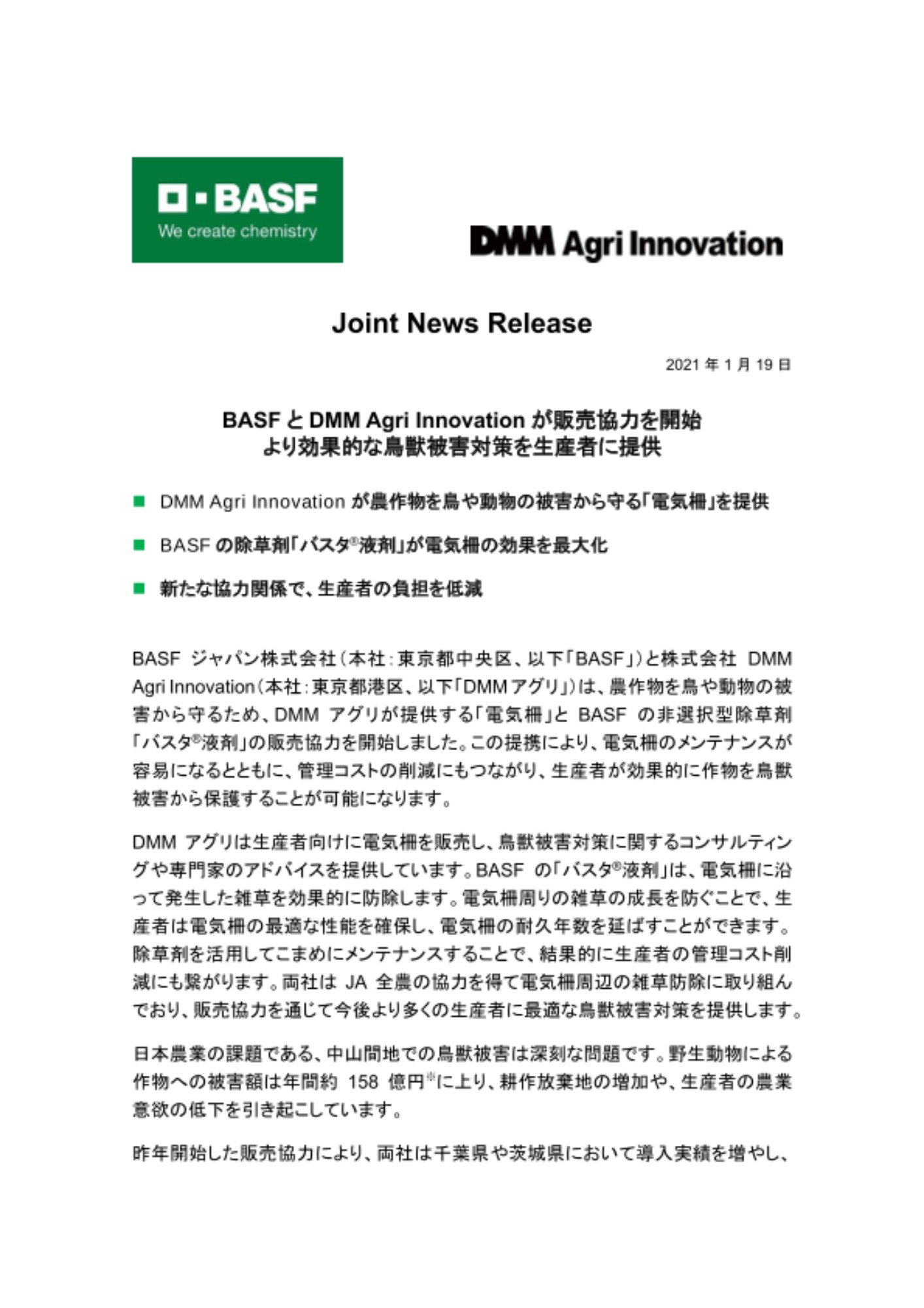 BASFジャパン株式会社(本社:東京都中央区、以下「BASF」)と株式会社 DMM Agri Innovation(本社:東京都港区、以下「DMMアグリ」)は、農作物を鳥や動物の被害から守るため、DMMアグリが提供する「電気柵」とBASFの非選択型除草剤「バスタ®液剤」の販売協力を開始しました。この提携により、電気柵のメンテナンスが容易になるとともに、管理コストの削減にもつながり、生産者が効果的に作物を鳥獣被害から保護することが可能になります。