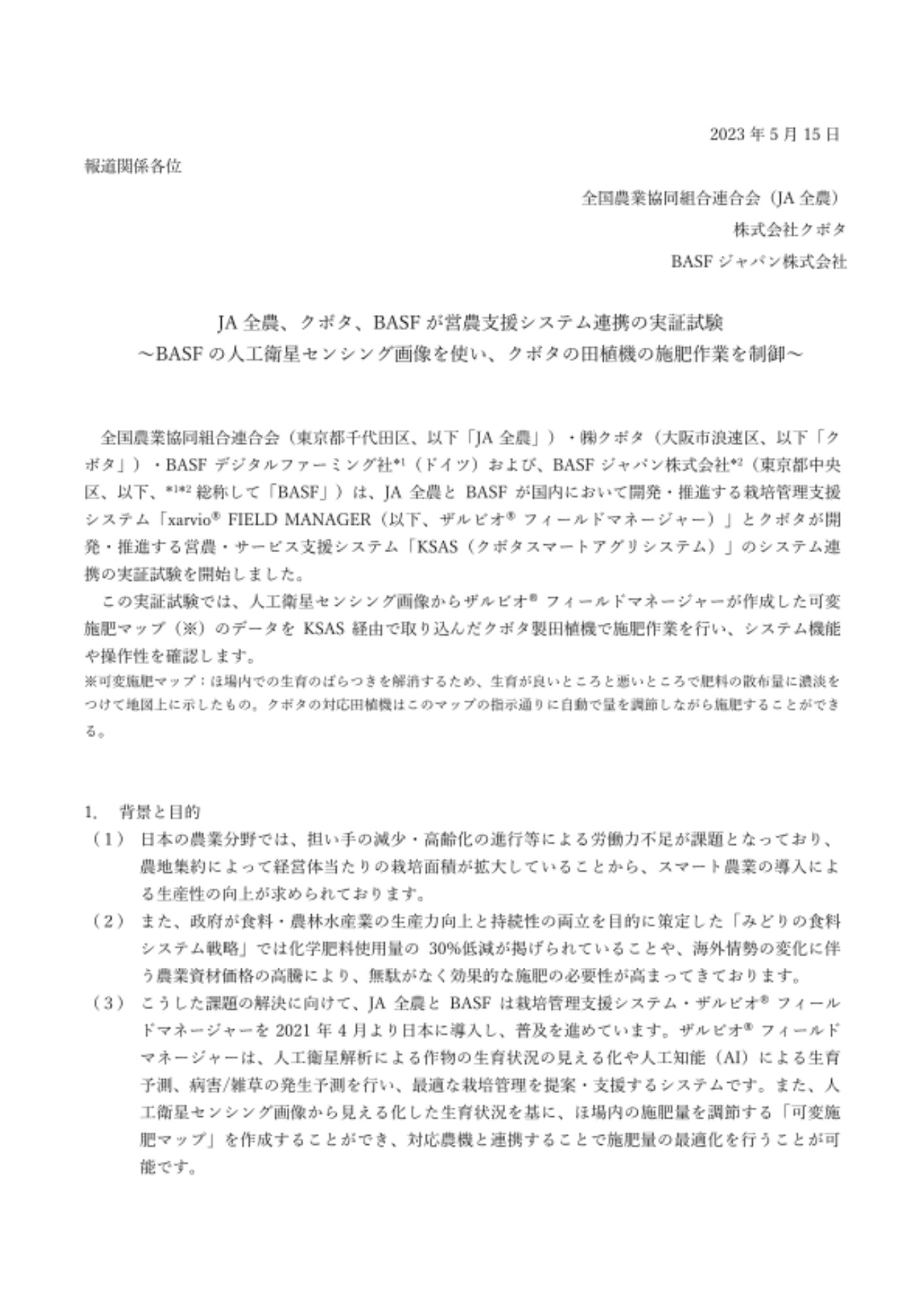 全国農業協同組合連合会(東京都千代田区、以下「JA全農」)・㈱クボタ(大阪市浪速区、以下「クボタ」)・BASF デジタルファーミング社*1(ドイツ)および、BASFジャパン株式会社*2(東京都中央区、以下、*1*2総称して「BASF」)は、JA全農とBASFが国内において開発・推進する栽培管理支援システム「xarvio® FIELD MANAGER(以下、ザルビオ® フィールドマネージャー)」とクボタが開発・推進する営農・サービス支援システム「KSAS(クボタスマートアグリシステム)」のシステム連携の実証試験を開始しました。