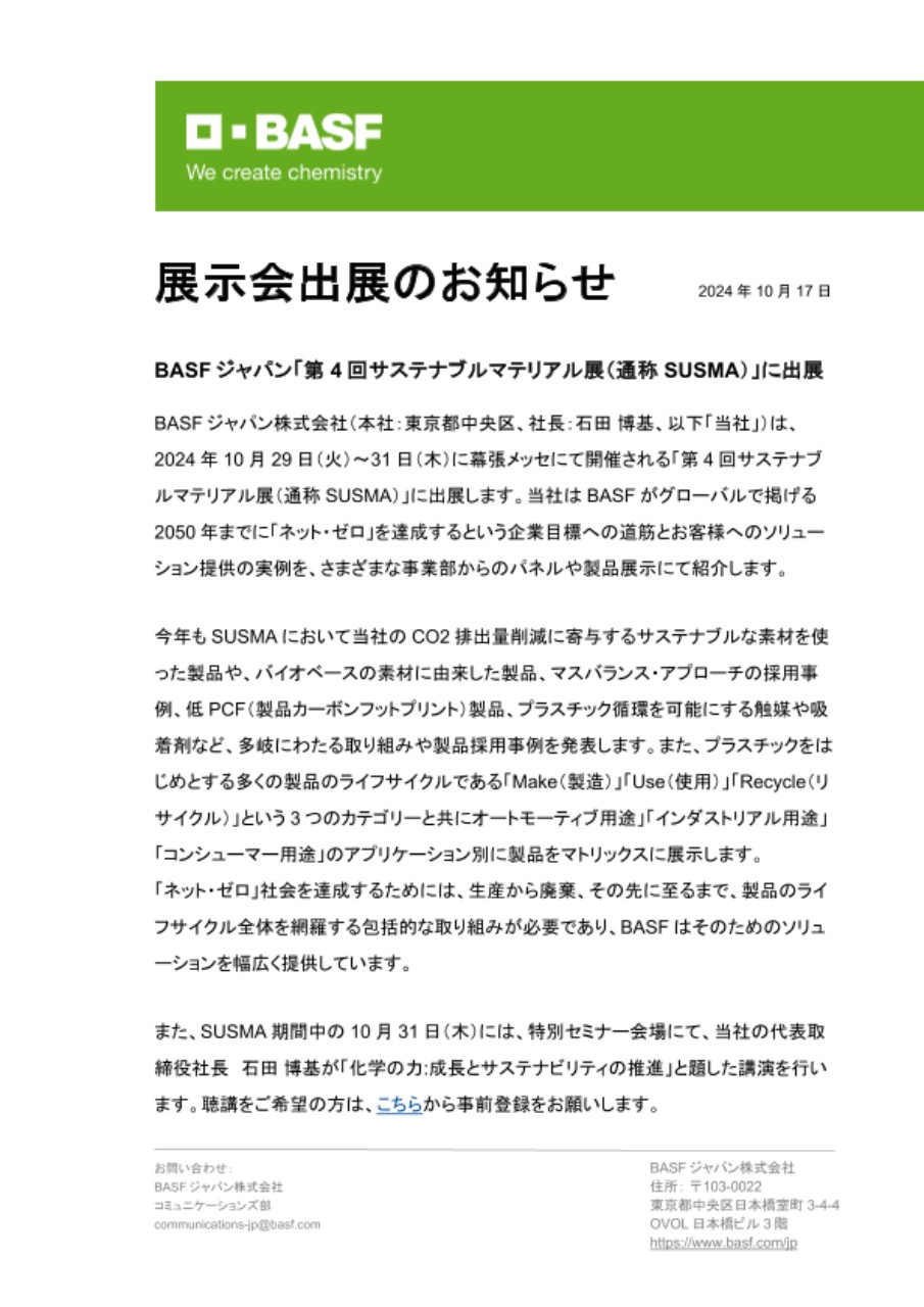 BASFジャパン株式会社(本社:東京都中央区、社長:石田 博基、以下「当社」)は、2024年10月29日(火)~31日(木)に幕張メッセにて開催される「第4回サステナブルマテリアル展(通称SUSMA)」に出展します。当社はBASFがグローバルで掲げる2050年までに「ネット・ゼロ」を達成するという企業目標への道筋とお客様へのソリューション提供の実例を、さまざまな事業部からのパネルや製品展示にて紹介します。