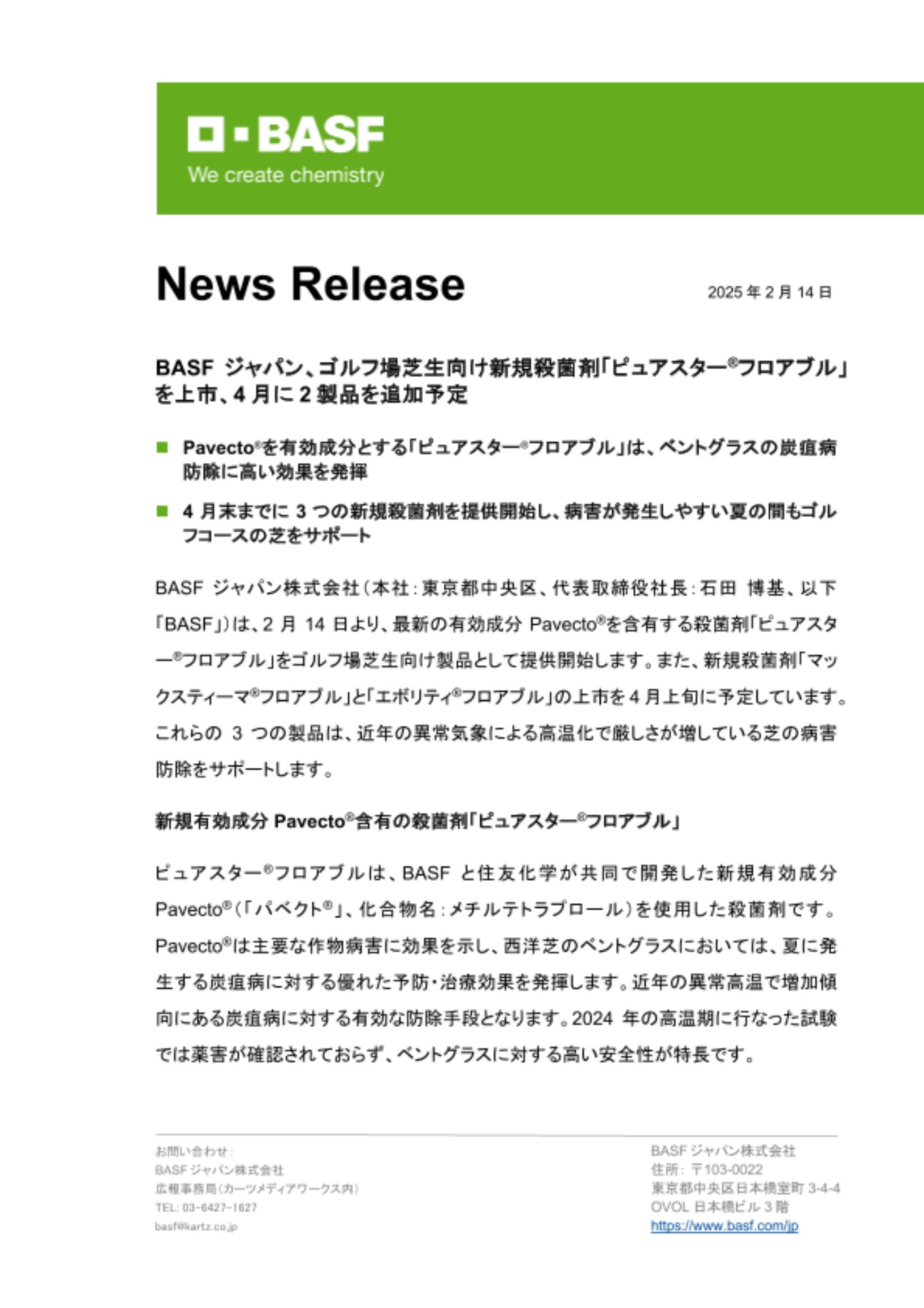 BASFジャパン株式会社(本社:東京都中央区、代表取締役社長:石田 博基、以下「BASF」)は、2月14日より、最新の有効成分Pavecto®を含有する殺菌剤「ピュアスター®フロアブル」をゴルフ場芝生向け製品として提供開始します。また、新規殺菌剤「マックスティーマ®フロアブル」と「エボリティ®フロアブル」の上市を4月上旬に予定しています。これらの3つの製品は、近年の異常気象による高温化で厳しさが増している芝の病害防除をサポートします。