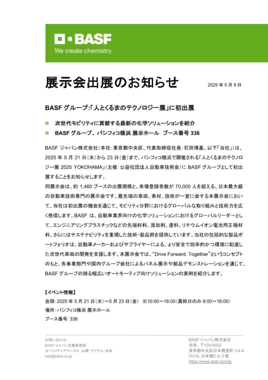 BASFジャパン株式会社(本社:東京都中央区、代表取締役社長:石田博基、以下「当社」)は、2025年5月21日(水)から23日(金)まで、パシフィコ横浜で開催される「人とくるまのテクノロジー展2025 YOKOHAMA」(主催:公益社団法人自動車技術会)にBASFグループとして初出展することをお知らせします。