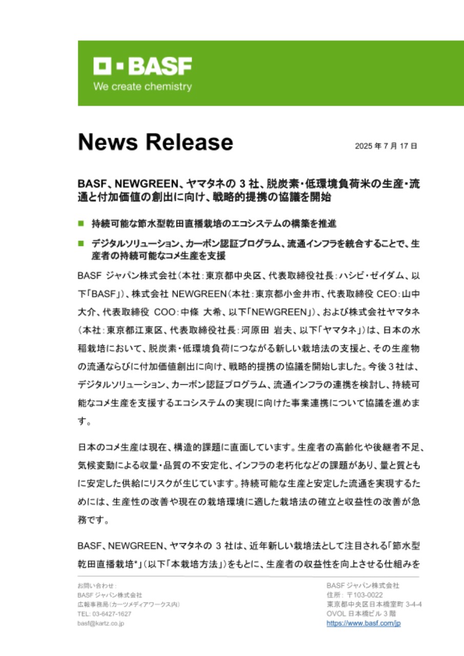 BASFジャパン株式会社(本社:東京都中央区、代表取締役社長:ハシビ・ゼイダム、以下「BASF」)、株式会社NEWGREEN(本社:東京都小金井市、代表取締役CEO:山中 大介、代表取締役COO:中條 大希、以下「NEWGREEN」)、および株式会社ヤマタネ(本社:東京都江東区、代表取締役社長:河原田 岩夫、以下「ヤマタネ」)は、日本の水稲栽培において、脱炭素・低環境負荷につながる新しい栽培法の支援と、その生産物の流通ならびに付加価値創出に向け、戦略的提携の協議を開始しました。今後3社は、デジタルソリューション、カーボン認証プログラム、流通インフラの連携を検討し、持続可能なコメ生産を支援するエコシステムの実現に向けた事業連携について協議を進めます。