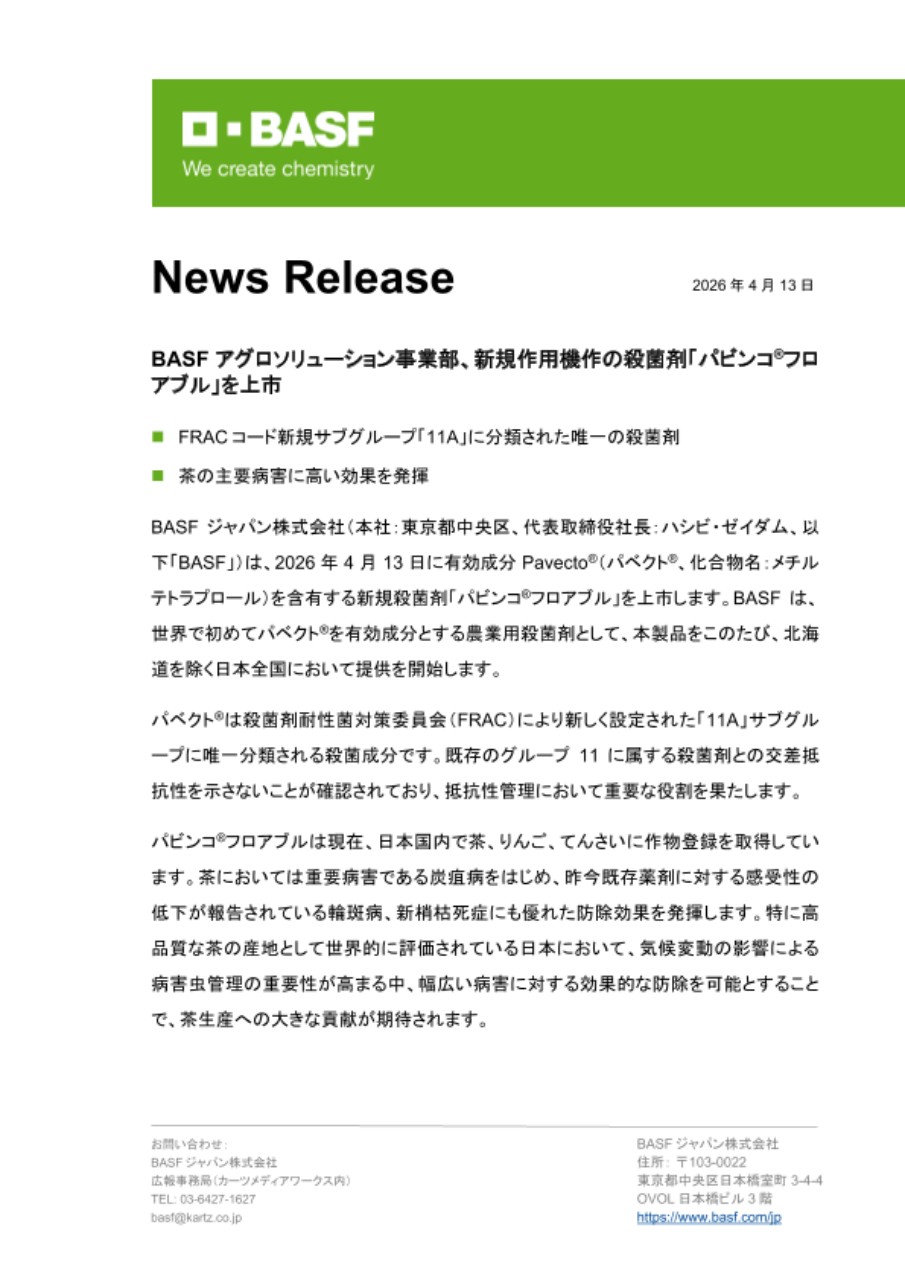 BASFジャパン株式会社(本社:東京都中央区、代表取締役社長:ハシビ・ゼイダム、以下「BASF」)は、2026年4月13日に有効成分Pavecto®(パベクト®、化合物名:メチルテトラプロール)を含有する新規殺菌剤「パビンコ®フロアブル」を上市します。BASFは、世界で初めてパベクト®を有効成分とする農業用殺菌剤として、本製品をこのたび、北海道を除く日本全国において提供を開始します。