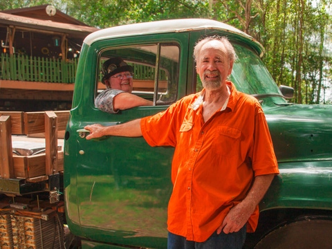 トレードマークである完全電動のフォード製56年式トラックに乗るオードリーとスティーブ
