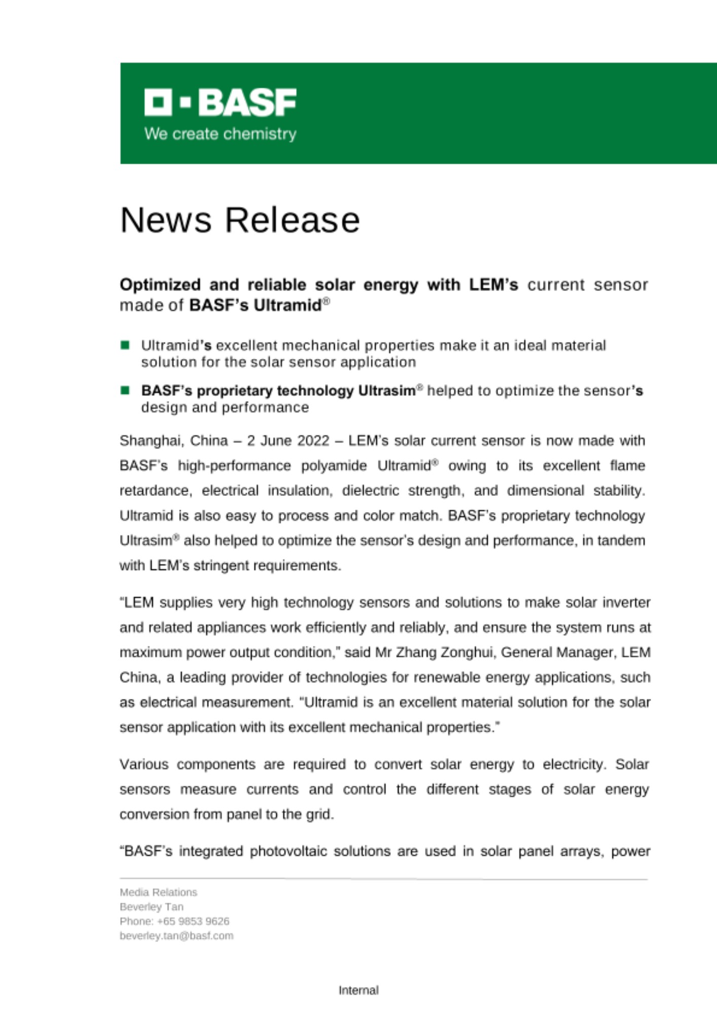 “BASF’s integrated photovoltaic solutions are used in solar panel arrays, power distribution, and energy storage systems. Our innovative material solutions and competences are helping customers such as LEM accelerate product development for electrical solutions and the transition to a sustainable future,” said Marilyn Lye, Vice President, Business Management Industrial, Performance Materials Asia Pacific, BASF.