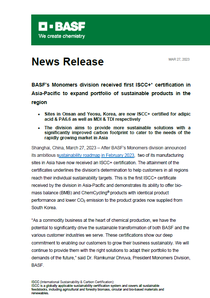 BASF’s Monomers division received first ISCC+* certification in Asia-Pacific to expand portfolio of sustainable products in the region