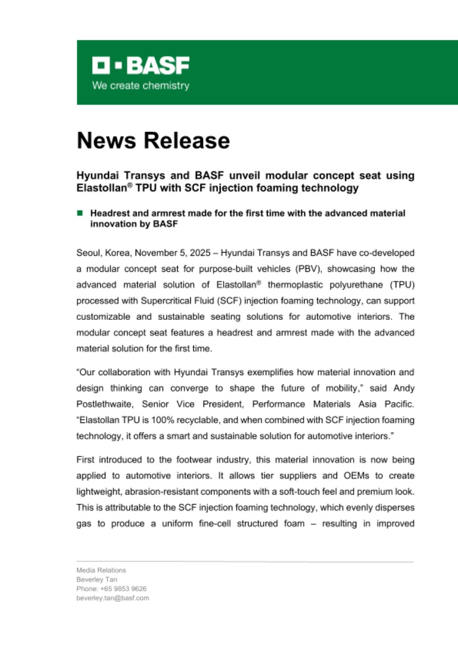 Seoul, Korea, November 5, 2025 – Hyundai Transys and BASF have co-developed a modular concept seat for purpose-built vehicles (PBV), showcasing how the advanced material solution of Elastollan® thermoplastic polyurethane (TPU) processed with Supercritical Fluid (SCF) injection foaming technology, can support customizable and sustainable seating solutions for automotive interiors. The modular concept seat features a headrest and armrest made with the advanced material solution for the first time.