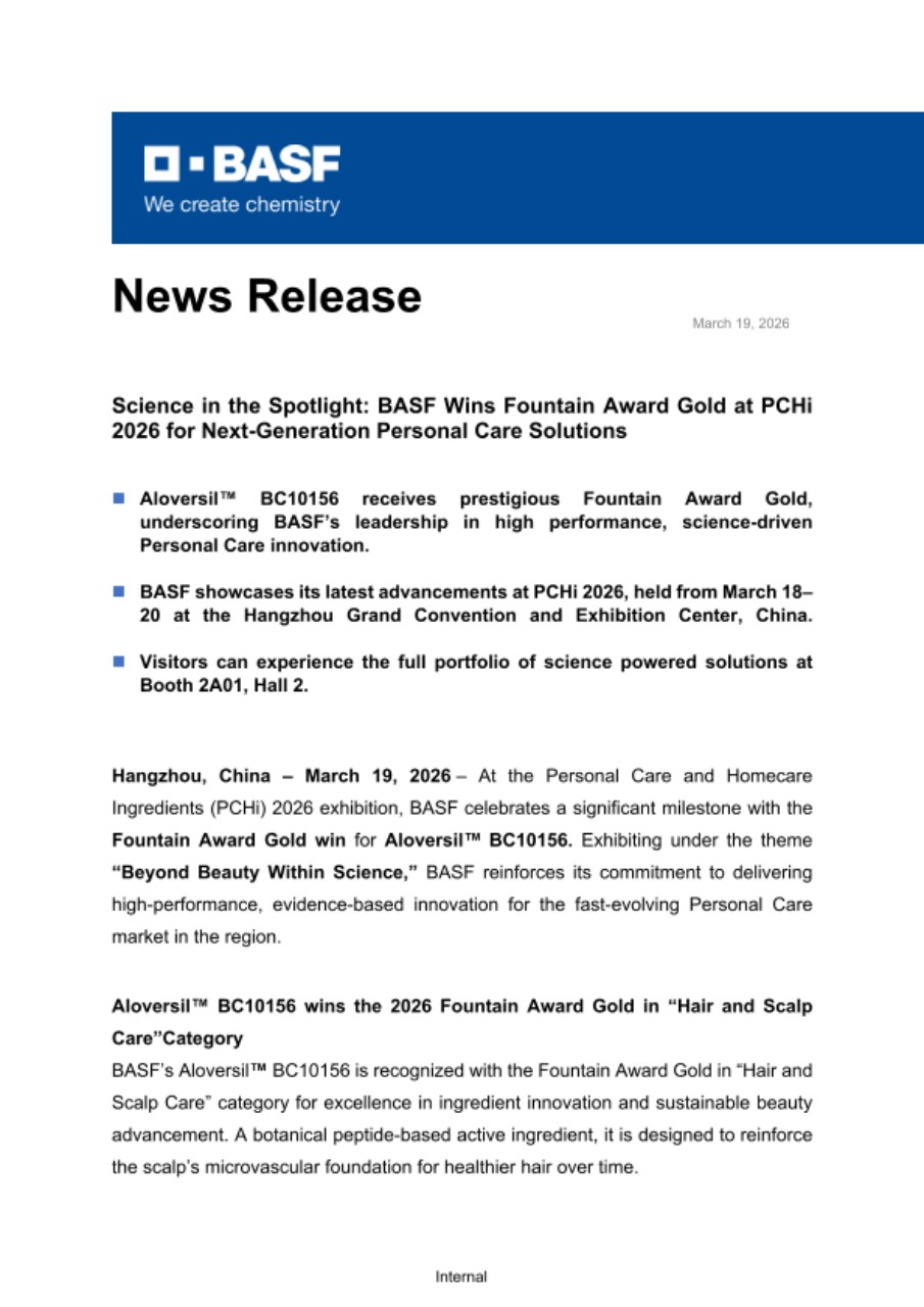 “We are honored to receive the Fountain Award for Aloversil™ BC10156 at PCHi, 2026,” said Agus Ciputra, Senior Vice President, Personal Care, Care Chemicals, BASF. “This achievement highlights the excellence of our science driven innovations and our focus on enabling partners and customers to meet the rapidly evolving expectations of beauty consumers across the region.”
