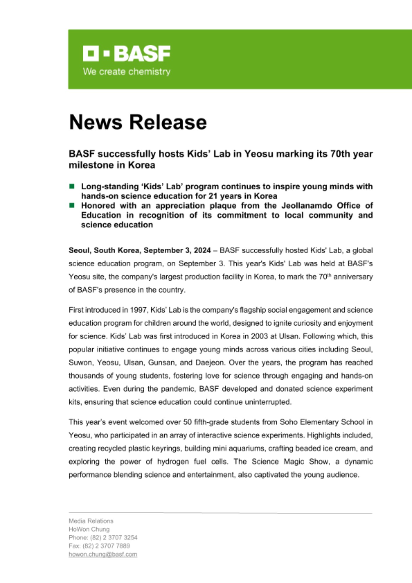 “Science experiments can spark children's curiosity and problem-solving skills. BASF Kids’ Lab aims to help them understand the critical role of sustainable chemistry, which we are committed to pursuing. This year, Kids' Lab will be held not only in Yeosu, but also in Gunsan and Seoul to commemorate BASF's 70th anniversary in Korea.” said Dr. Dschun Song.