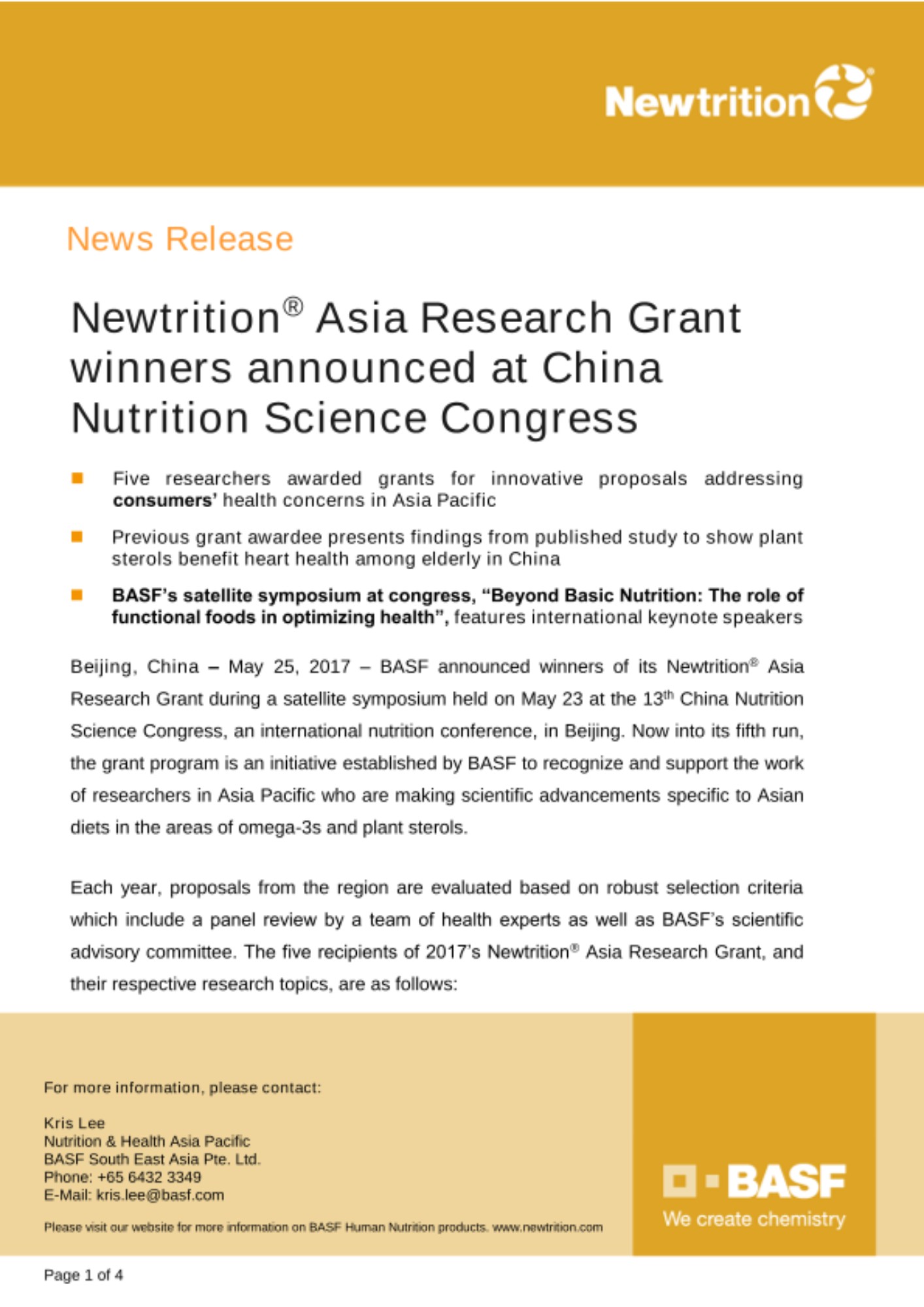 Beijing, China – May 25, 2017 – BASF announced winners of its Newtrition® Asia Research Grant during a satellite symposium held on May 23 at the 13th China Nutrition Science Congress, an international nutrition conference, in Beijing. Now into its fifth run, the grant program is an initiative established by BASF to recognize and support the work of researchers in Asia Pacific who are making scientific advancements specific to Asian diets in the areas of omega-3s and plant sterols.