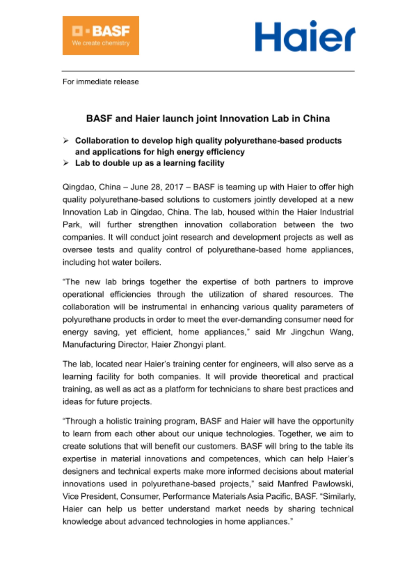 Qingdao, China – June 28, 2017 – BASF is teaming up with Haier to offer high quality polyurethane-based solutions to customers jointly developed at a new Innovation Lab in Qingdao, China. The lab, housed within the Haier Industrial Park, will further strengthen innovation collaboration between the two companies. It will conduct joint research and development projects as well as oversee tests and quality control of polyurethane-based home appliances, including hot water boilers.
