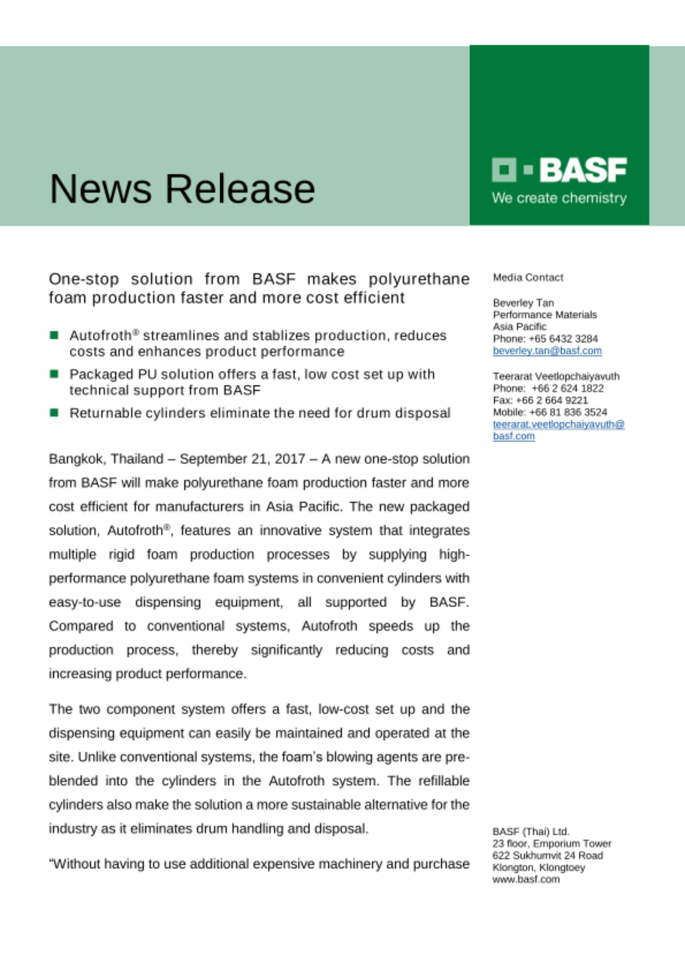 Bangkok, Thailand – September 21, 2017 – A new one-stop solution from BASF will make polyurethane foam production faster and more cost efficient for manufacturers in Asia Pacific. The new packaged solution, Autofroth®, features an innovative system that integrates multiple rigid foam production processes by supplying high-performance polyurethane foam systems in convenient cylinders with easy-to-use dispensing equipment, all supported by BASF. Compared to conventional systems, Autofroth speeds up the production process, thereby significantly reducing costs and increasing product performance.