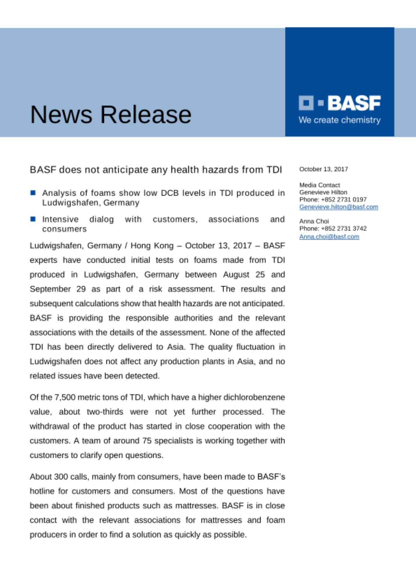Ludwigshafen, Germany / Hong Kong – October 13, 2017 – BASF experts have conducted initial tests on foams made from TDI produced in Ludwigshafen, Germany between August 25 and September 29 as part of a risk assessment. The results and subsequent calculations show that health hazards are not anticipated. BASF is providing the responsible authorities and the relevant associations with the details of the assessment. None of the affected TDI has been directly delivered to Asia. The quality fluctuation in Ludwigshafen does not affect any production plants in Asia, and no related issues have been detected.