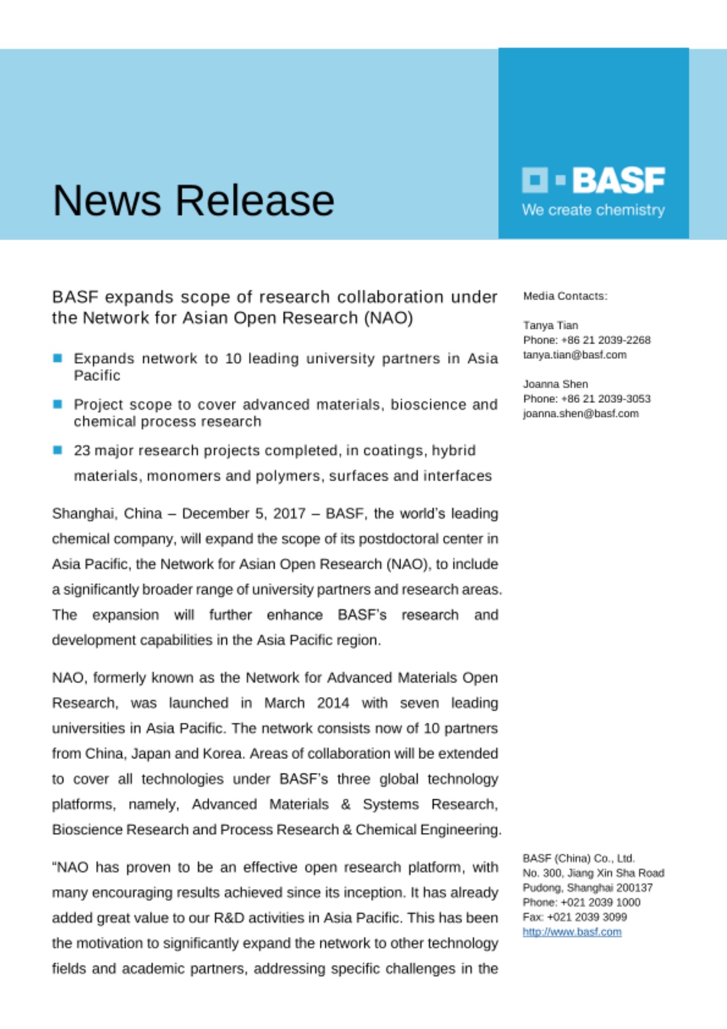 Shanghai, China – December 5, 2017 – BASF, the world’s leading chemical company, will expand the scope of its postdoctoral center in Asia Pacific, the Network for Asian Open Research (NAO), to include a significantly broader range of university partners and research areas. The expansion will further enhance BASF’s research and development capabilities in the Asia Pacific region.